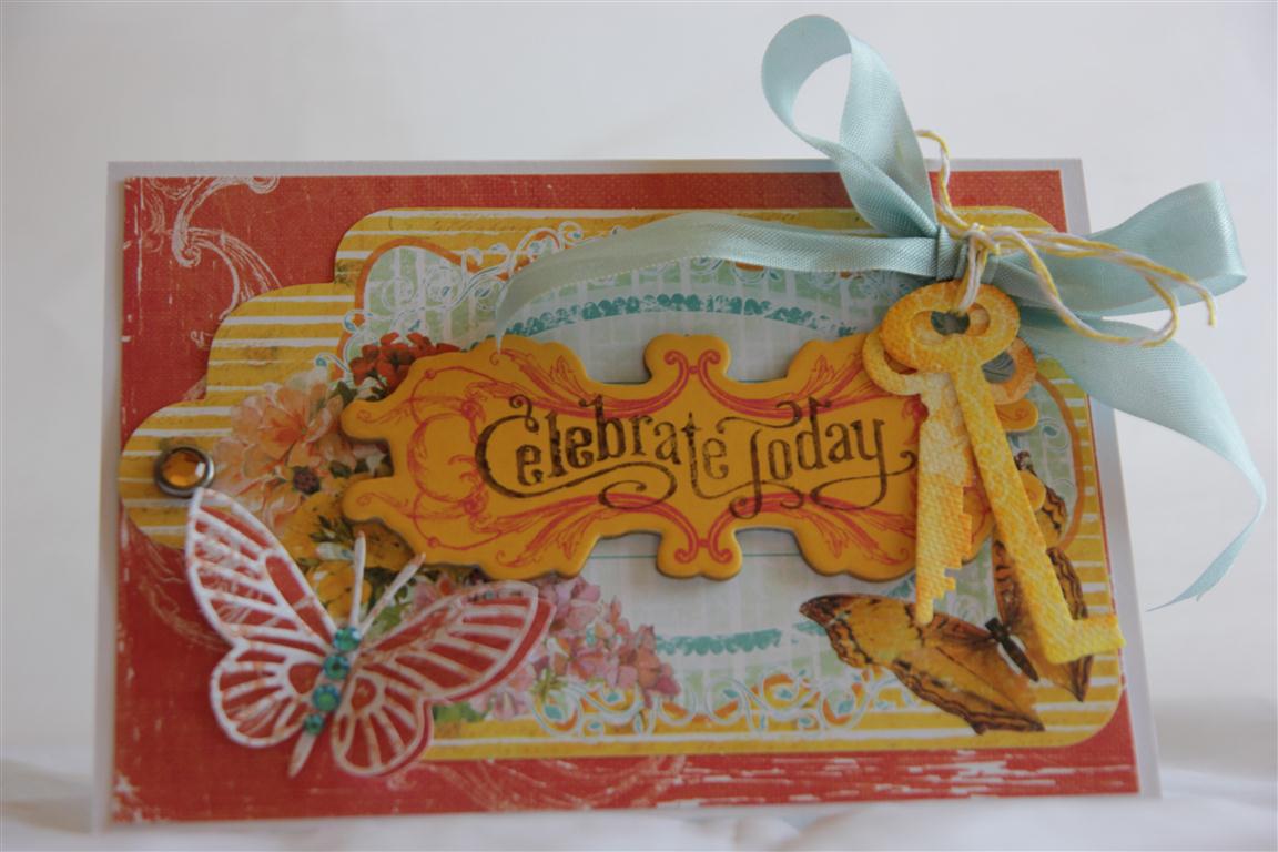 I feel in the mood for something bold and bright this afternoon, and this card fits the bill nicely! The paper, chipboard and Journalling notecard are all from the Prima Zephyr collection,and the sentiment and Pool Party seam binding are from stampin Up.The butterfly was die cut using Memory Box Moonlight and Kaliedascope butterfly dies, and I used a little bakers twine as well. I kept the canvas keys til last because these are something new I found and I love them. They are Prima resist canvas ( the pack these came from was the clocks, gears and keys pack). Its a pack chock full of die cut shapes, and when you colour them – I used a tim holtz ranger ink pad and a blending tool, there is a pattern that resists the ink. I bought the pack with the birds in it too, which I haven’t used yet, but may get the opportunity now that my week – end has started – Yay!So looking forward to getting into the craft room and playing wiht all my new paper purchases! Til tomorrow….