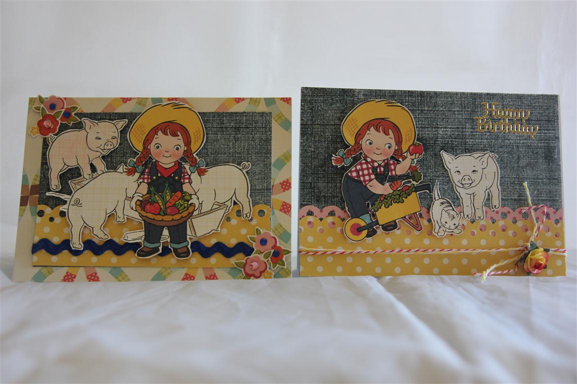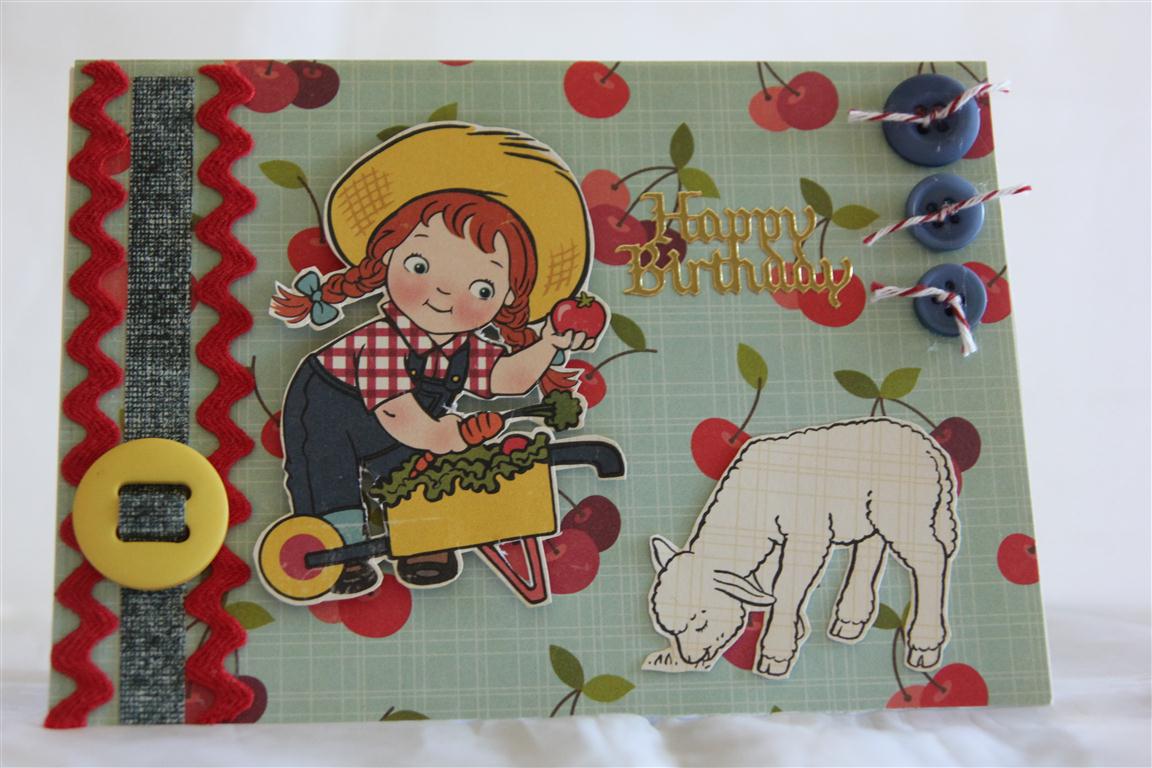I loved working with this new paper from October Afternoon, called farm Girl. The images on one of the 12 x 12 sheets of paper were crying out to be fussy cut, ( that is the little girl with an assortment of animals) and the other papers in the collection are gorgeous and bright. I used a Martha stewart punch,Bakers twine, flower rhinestones, and ric rac ( which I found in my Late grans sewing bits and pieces). in Particular the ric rac and bakers twine go perfectly with this paper.I fussy cut a few flowers from another piece of paper in the collection to finish. This was such an easy collection to work with – I made a lot of cards all in one sitting, and for once had no bits of papers left over ! Til tomorrow….