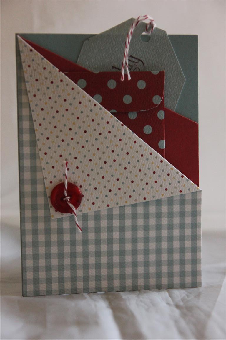 I found in my archives a group of cards that I haven’t shown, although I made them a little while ago, and had a very hard time remembering the name of the paper – thank goodness for google – Crate Paper Little boy Blue. I only purchased 2 or 3 sheets of this paper, but got quite a lot of cards out of it – here are the first two.I used a scalloped edge punch, and made good use of my button tin and bakers twine for these two. The cardstock is Stampin Up real red. I am busy today organising some lessons, and the craft room clean up continues…. Til tomorrow…
