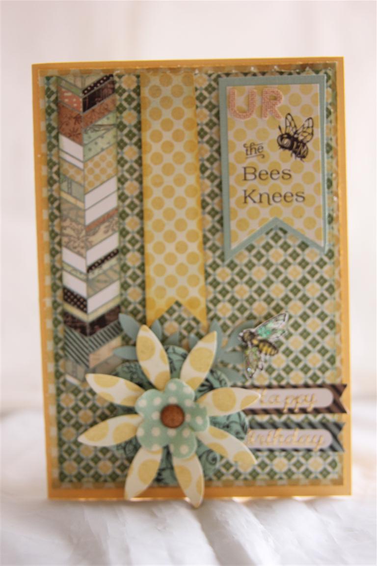 This collection of paper is Basic grey Serenade, and I have used the 6″ pad on all the cards I made with this collection. I ran with the Bee theme, and used some of the papers that resembled bee hives, and cut them into strips , and the die cut flower is from a packet that is part of this collection. I stamped another bee to add to the flower, and punched a couple of leaves with my Martha Stewart frond punch.I inked all the edges with Stampin Up so saffron ink, and that is the cardstock used as well!Tea is ready, so i have to run – Til tomorrow….