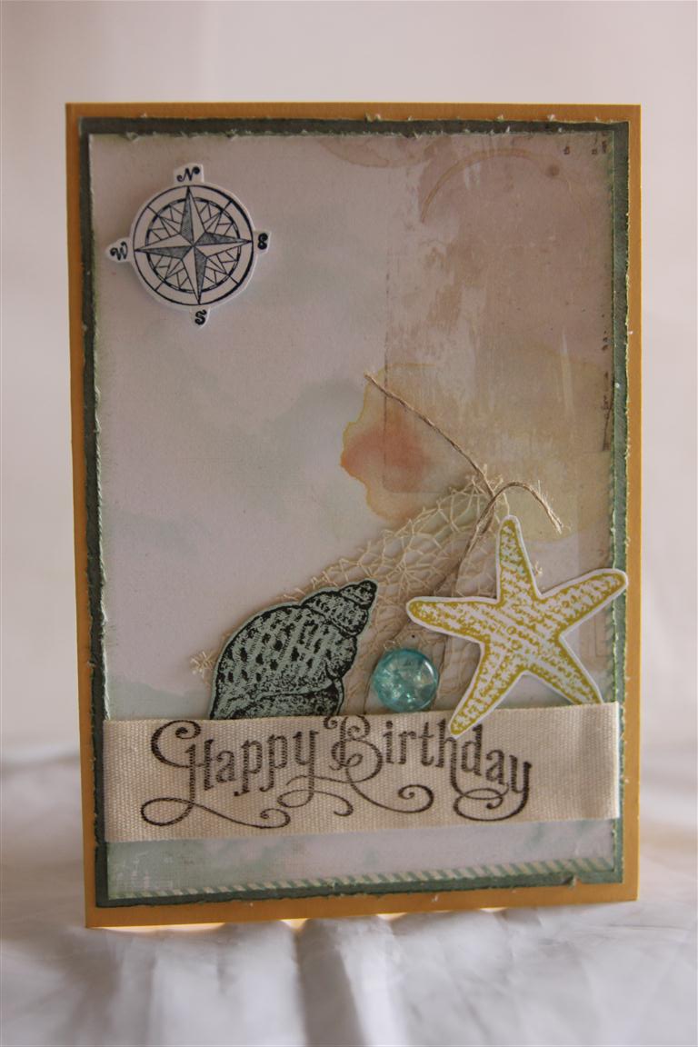 A mens card today! Basic Grey serenade 6″ pad, stampin Up cardstock, perfectly penned stamp( for the sentiment) and Stampin Up by the seashore stamp set for the shells. I stamped one image on cream cardstock, and the other on patterned paper. I like stamping on patterned paper, and it worked well in this case. I have spent today setting up a class for the retirement village, I might head into the craft room now for a short while, but I think tonight is going to be a lazy one in front of the T.V. Til tomorrow….