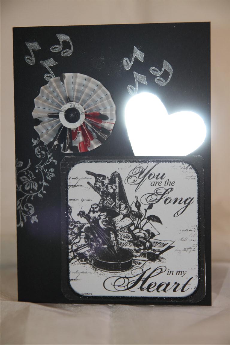 A late post today, I have been waiting for a vidoe clip to upload, but it is taking quite some time, so hopefully I will be able to post it later, if not you will see it tomorrow. so for now… Bo Bunny Enchanted number three. This is a fun Valentines day card,with a sizzix tim Holtz rossette die cut with an old scrap of kaisercraft paper, a heart punched from silver cardstock, a Stampin up flourish stamp, and a kaisercraft music stamp( both stamped in silver ink).Poor Nathan was temporarily blinded taking this shot – the silver card bounced back the flash straight into his eyes – he has since bought a flash diffuser but it doesn’t work so he thinks a pair of sunnies would be the answer! Hopefully later my video will be up….Til tomorrow….