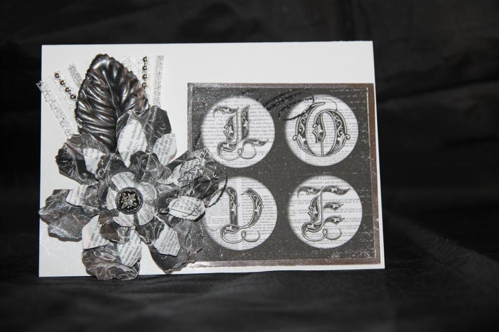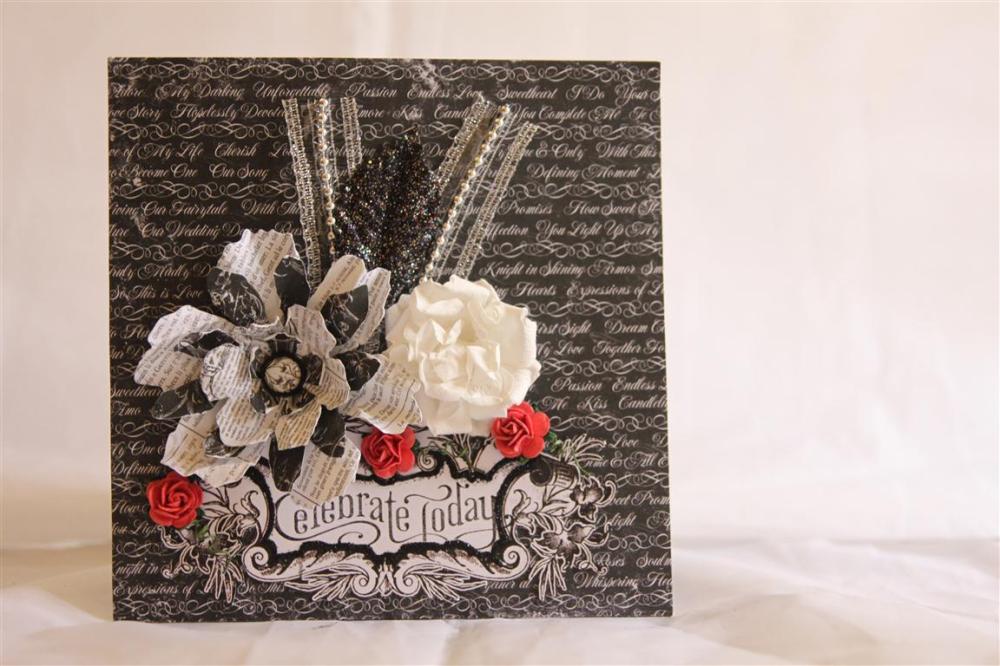 Here is something completely different for me – Monochrome cards… This particular card was created for a relative that recently became engaged, and I used Bo Bunny Enchanted 6″pad, a matching brad and a pre printed label from a matching 12 x 12 paper. I added some flowers, pretty beaded ribbon and a prima leaf. I die cut a sizzix tattered floral from more of the papers from the 6″ pad. The greeting was stamped with Stampin Up perfectly penned. I would love a bit of feedback on these monochrome cards so let me know what you think! Til tomorrow…..