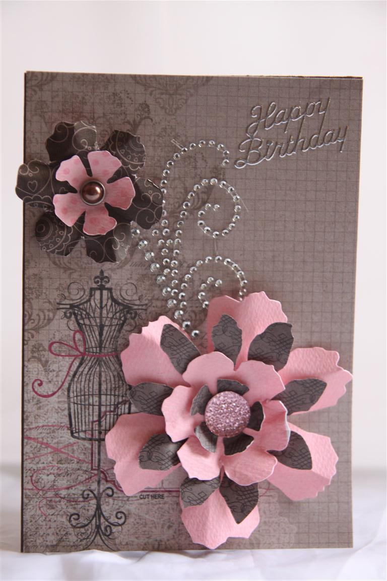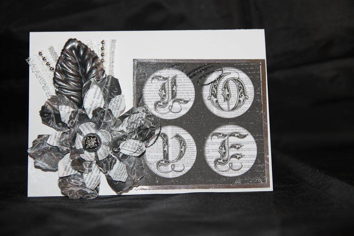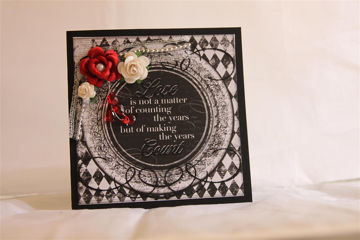 I think this is number 5 … I have lost count… Bo Bunny Enchanted paper teamed with assorted flowers, beaded ribbon and magnolia tear drops. Thats the end of my monochrome series, hope you enjoyed it.. tomorrow we will have some colour! Tonight I will be found in the craft room playing with some new paper that I have had for a little while but haven’t had a chance to cut into yet! til tomorrow….