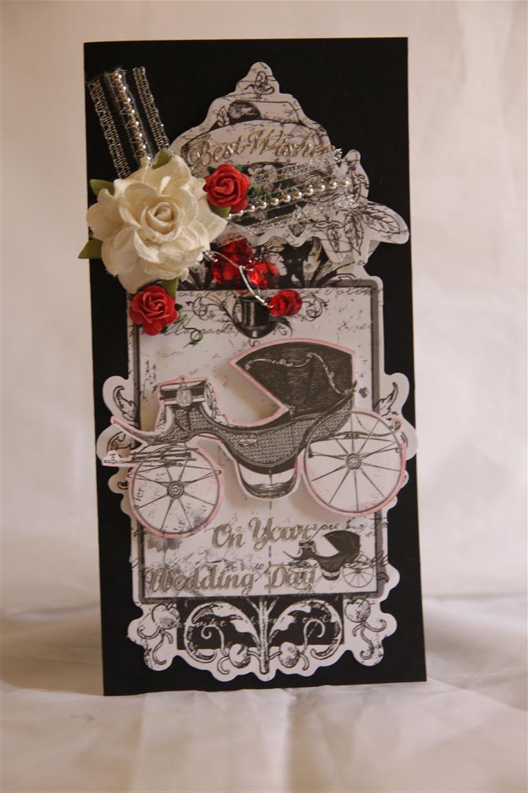Yesterday was an engagement card, and today is a Wedding card! Here I have used Stampin up basic black cardstock with a few of Bo Bunnys’ Noteworthy Journal die cuts ( Enchanted) layered on top of one another, and edges inked. I have also added flowers and beaded ribbon. Mum, Kay and I had a lovely day visiting a crafty friend who lives in the Adelaide hills, so we had a nice drive, and stopped to by some fresh produce from a roadside stall on the way. Very relaxing, and just what the doctor ordered after a busy week at work.Tonight I intend to continue crafting with the supplies I pulled out today to take to Sandy’s as I have to confess we did a fair amount of chatting and not too much crafting! Great fun…. Til tomorrow…..