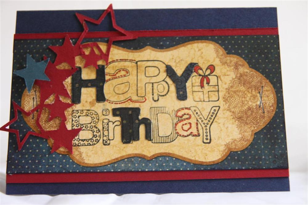 Here is my last card in my teen boy series, this time using the new Bo Bunny Weeekend Market papers – I love the rich colours of this paper and can’t wait to do some more with it -and my papermania happy birthday stamp which I stamped twice onto patterned paper and fussy cut out a few letters – and outlined a couple more with a marker. The stars are cut with my cricut and the wild card cartridge, and the cardstock is Stampin Up Cherry cobbler. I am busy this week making some cards to start filling those market boxes..Til tomorrow….