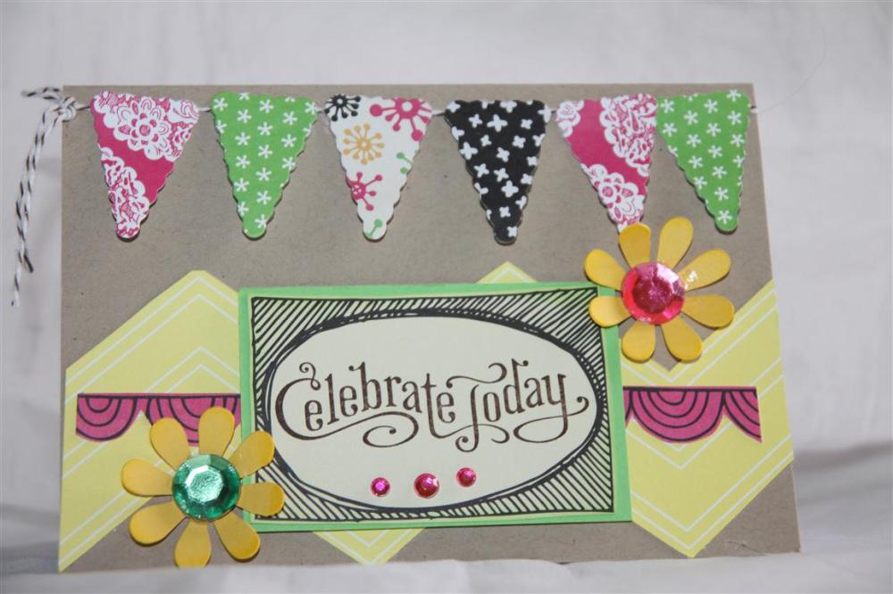 Here is a bright card to brighten up our dull, cold adelaide weather! The patterned paper is American Crafts amy tangerine Sketchbook, and the cardstock is stampin Up crumbcake. The banner across the top is die cut with spellbinders lacey pennant die, and I also used Stampin Up Blossom Party die for the flowers.The sentiment is stamped with stampin Up perfectly penned stamp. I had a thoroughly enjoyable day at the craft fair today, took my Mum with me to help out, and I had to stop her from spending all the profits at the other stalls – I hardly saw her all day!Tomorrow Kay ( my sister) is coming to give me a hand- I just hope I see more of her than I did of Mum! Til tomorrow….