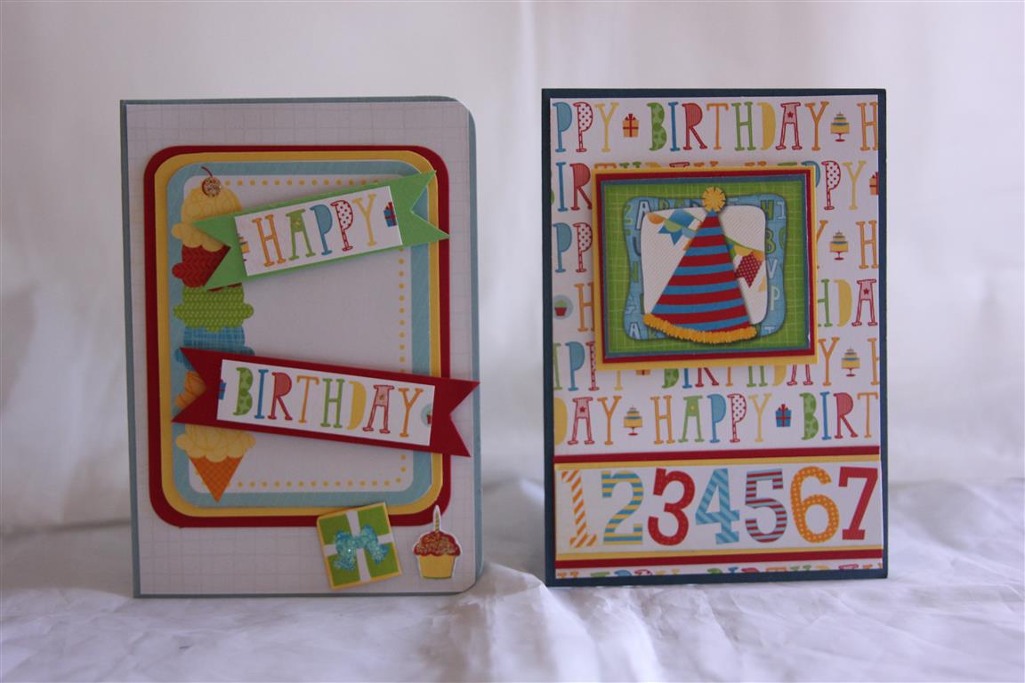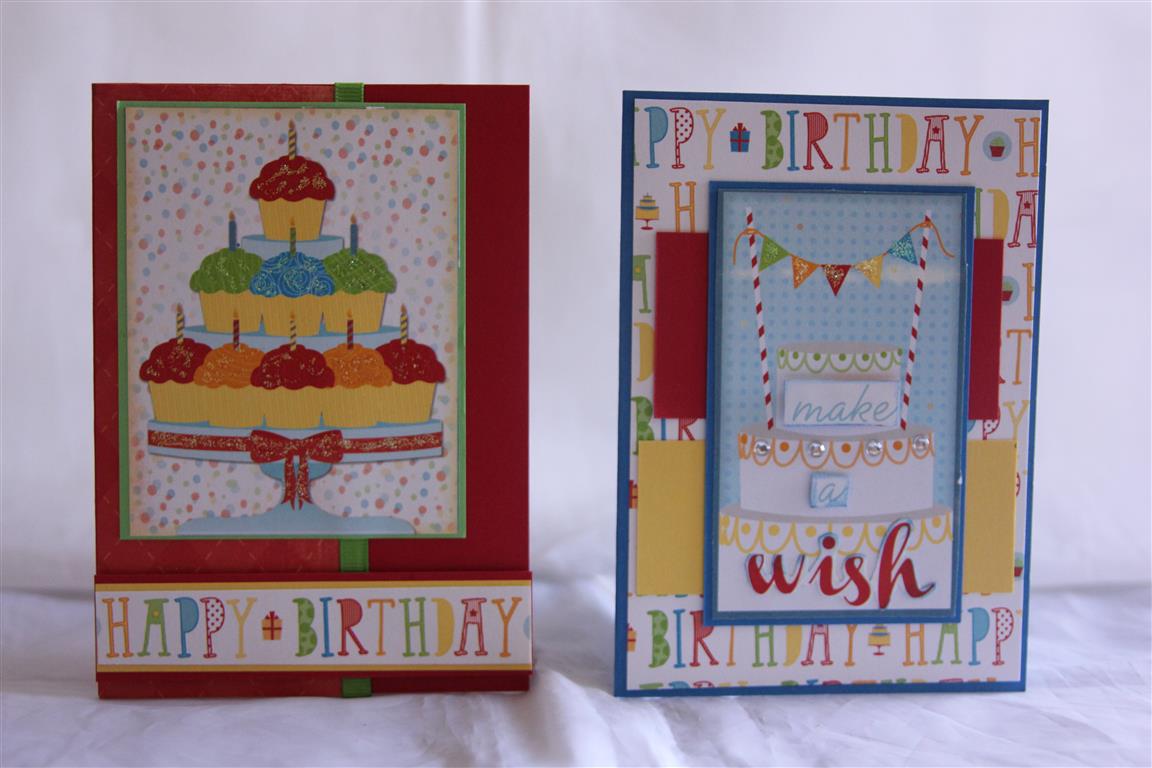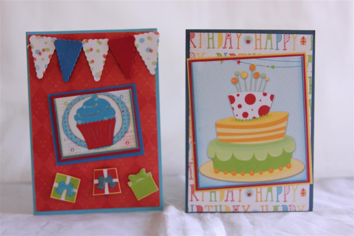 Here are 5 and 6 in my Bo Bunny Surprise series. Still with the same original 5Â 12 x 12 sheets of paper, but used spellbinders pennant dies to make the bunting for the card on the left. I used Stampin Up cardstock for the card bases and various mats. Busy day today, pulling out my market boxes to see what cards I still need to make for my craft fair stall in two weeks time – have a list so will be very busy in the craft room . Lucky my holidays start at the end of this week! Til tomorrow…
