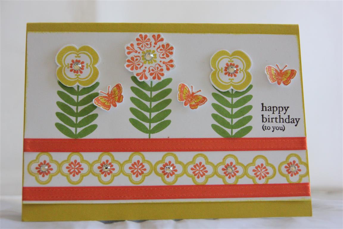 This is a nice bright card for a change! All supplies are from Stampin Up – the stamp set is Madison Avenue, and the butterflies were stamped with a stamp from Clearly for you stamp set. The cardstock is Summer Starfruit and whisper white, and the stamp pads I used were gumball green,tangerine tango and summer starfruit. I added a little bling and some tangerine tango ribbon to finish.I stamped the flower heads separately and fussy cut them so that I could mount them with foam pads for a bit of dimension.I have a baby card to make for an order tonight, then feet up in front of the tv! Til tomorrow….