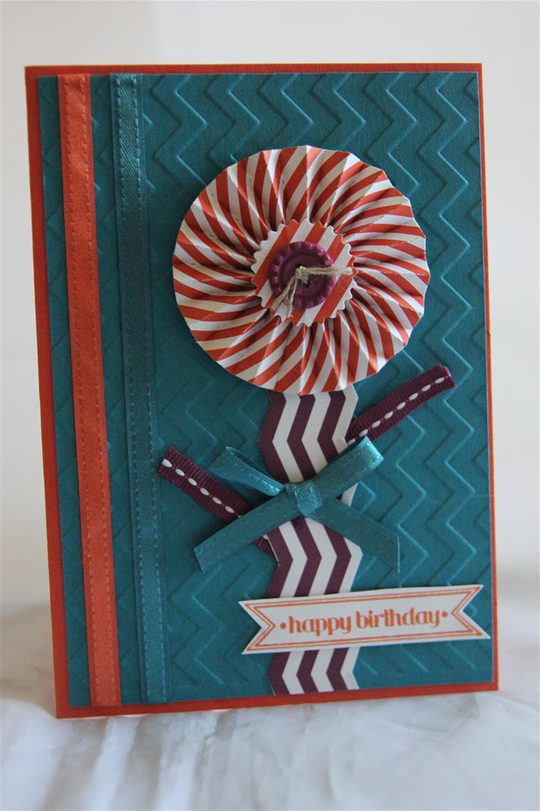 Today we leave behind the stamping, but stick with the bold andd bright colours! The scrap of paper I used for the flower stem is from Stampin Up Madison Avenue, and I used stampin up cardstock and matching ribbon – Tangerine tango and island indigo.The die used is sizzix tim holtz rosette, and the embossing folder is stampin up chevron folder.I stamped my greeting with a stamp from the itty bitty banner set from stampin up in tangerine tango ink. This afternoon I have been busy making a new home card for an order, and I have some things laid out on the craft table ready to go for an ideas I have, but this weekend has to be about Fathers day cards ( just a few more to do) and xmas cards. Til tomorrow….