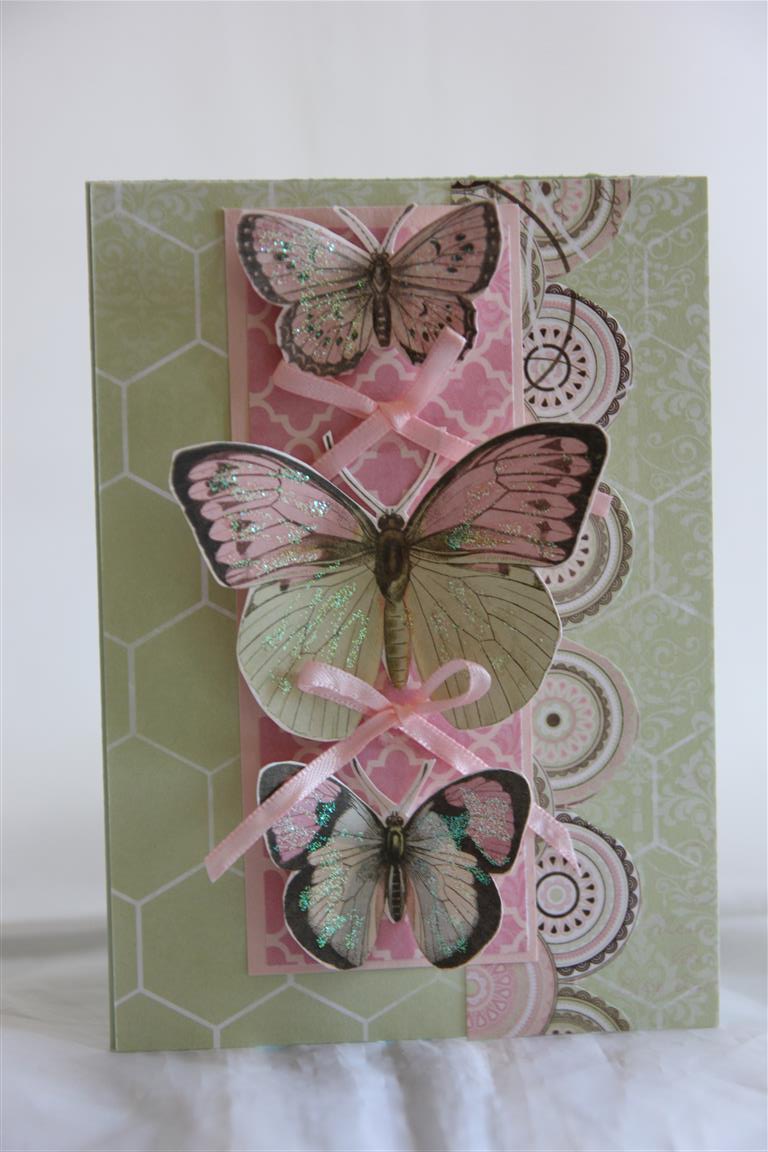 Nathan got out his camera today and we took some photos so I have a lot of very recent cards to show you all over the next couple of weeks. The first group are all made using Kaisercraft Secret Admirer collection. I haven’t yet been able to purchase my 6″ pad as there has been a little hold up with availability, so I have been using the 12 x 12 papers and on this first card I also added some ribbon,pearls ,lace and kindyglitz. The butterflies are die cut with Cheery Lyn Exotic Butterflies,and the sentiment is Stampin Up perfectly penned. I am off to the craft room for a couple of hours to unwind after a very busy and stressful week! Til tomorrow….