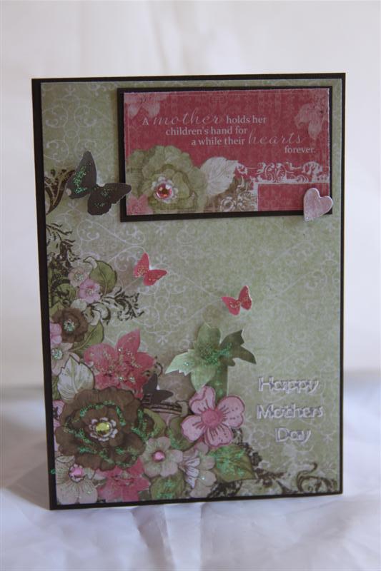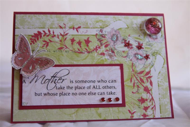 Another Mothers day card! This time using Prima Sparkling springtime paper,and pebble, and Kaisercraft rub-on and bling. I also used stampin up cardstock – Melon mambo. Tonight my techie son is going to show me how to do some things on the computer, so may or may not get into the craft room! Til tomorrow…..