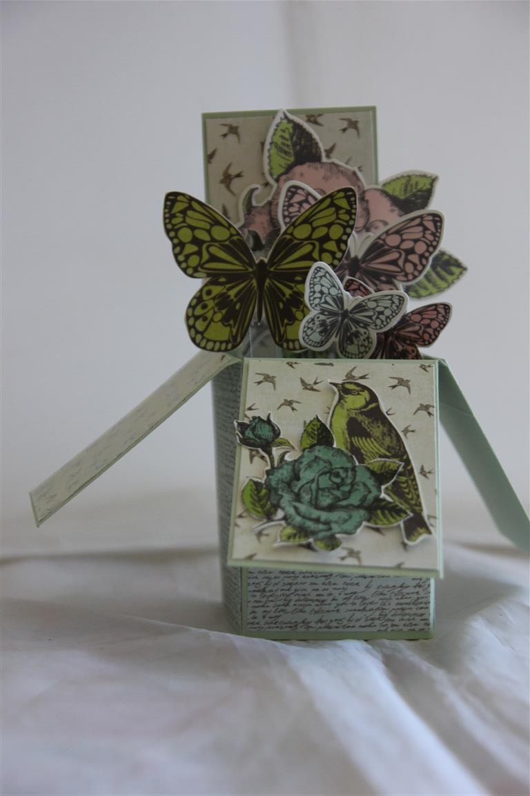 Today will be my last post for about a week, as I am off to visit my son in Sydney! It is also the last card I made using Kaisercraft True Romance paper collection. I have a you-tube clip ( see link on right hand side of blog) to show you the measurements for my box card,and I have just used the papers, inking around the edges of all the panels with tea dye distress ink, and added a bow. All the other pieces were fussy cut fromthe papers. I spent a little time in the craft room this morning, hoping to prepare my classes for december, but the shoulder is still not the best even with yesterdays cortosone injection, so I have had to give up, and will sit and rest it for a while with a good book! Til next week…