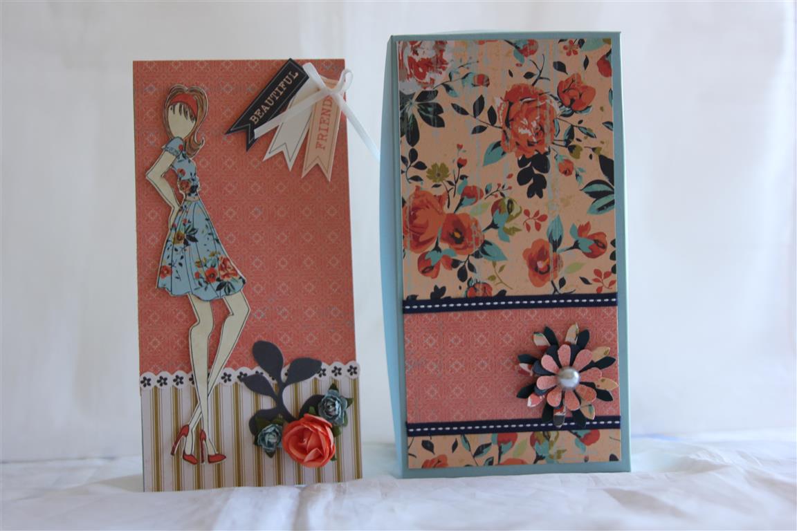 kaisercraft blubelle 12 x 12 paper, 6″ paper pad, and matching collectables.On the left is the card – I stamped a Prima Julie Nutting stamp onto some neutral paper, and cut out, and again onto patterned paper, and cut out the dress and put her back together.I added some collectable banners in the right hand corner with some ribbon,and added kaisercraft flowers in the lower right hand corner.On the right is the box, which I kept simple, making a flower using my stampin up blossom party die.the cardstock used is stampin up. I was missing yesterday as I haven’t been well – I am suffering from a cold, and feeling more than sorry for myself! Luckily the lemon tree has lots of fruit on it so I have been drinking lemon and honey drinks and that does seem to help a bit.Til tomorrow….