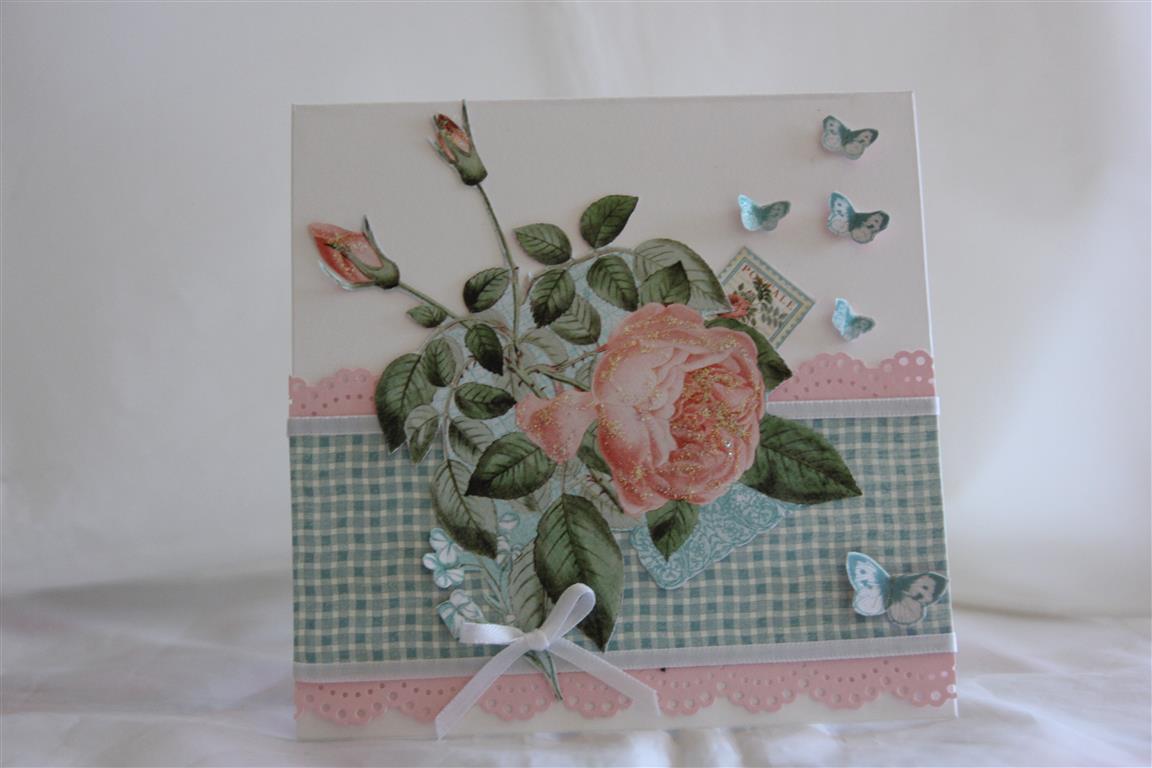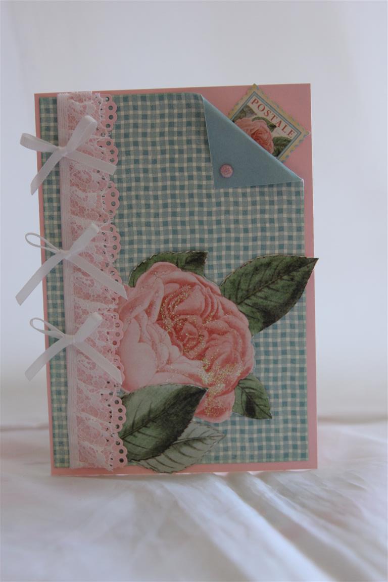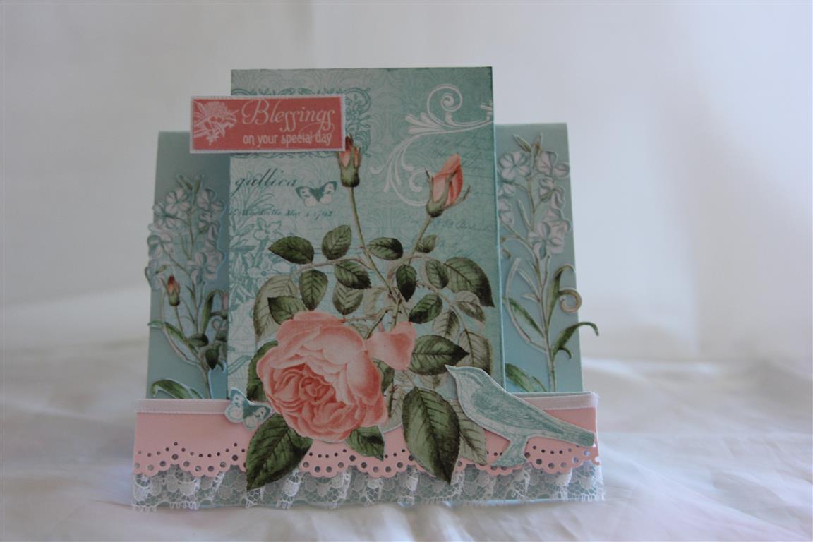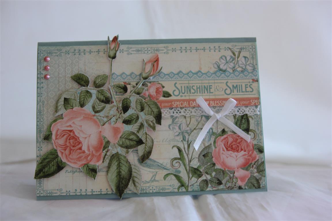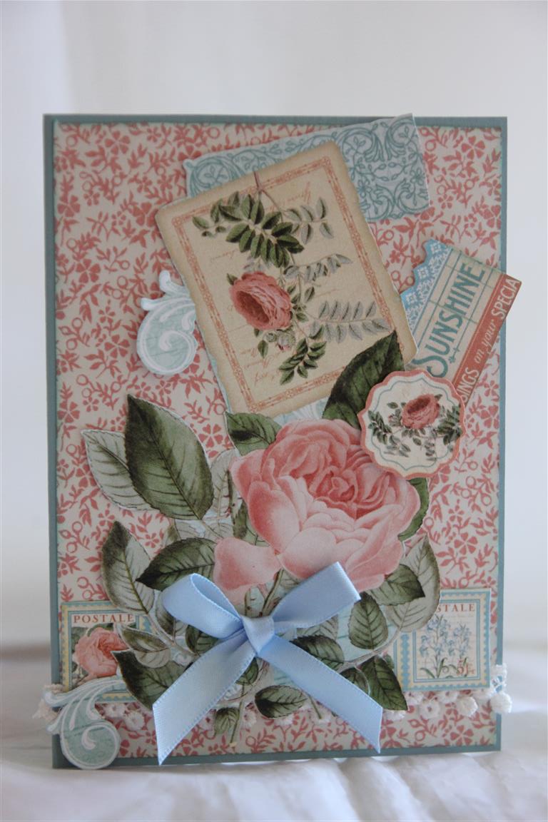 Card number 2 made from graphic 45 Time to flourish ( June sheets) . It’s no wonder I started with this month in the 12 x 12 paper pad – these colours together are my favourite!I fussy cut another rose and a piece of the border trim, and added a ribbon bow, lace and some liquid pearls. the cardstock is Stampin Up baja breeze, sadly retired, but I bought up big on this colour before it disappeared! til tomorrow….