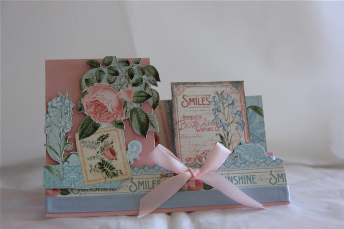 This one is a side stepper card, ( graphic 45 time to flourish June papers) again, I just sat down with my cardstock and ruler and fiddled with measurements until I made something that would fit into a normal c6 envelope. Luckily for me I scribbled down the measurements and made templates of all these cards so that I could do them again, because I really like this one in particular – it’s perfect for showing off this beautiful paper. My holidays start at the end of next week, and I will get Nathan organised with the video camera and we will do a bit of a clip on how I made this one and the previous card posted so that you can all try ! As for the rest…. fussy cut bits , and layers on each step( which you can’t really see in the photo) and a gorgeous ribbon bow to finish. Two days of 6 am starts over with, a day off tomorrow, one more day of work and three days off after that – got to love long weekends!! Til tomorrow….