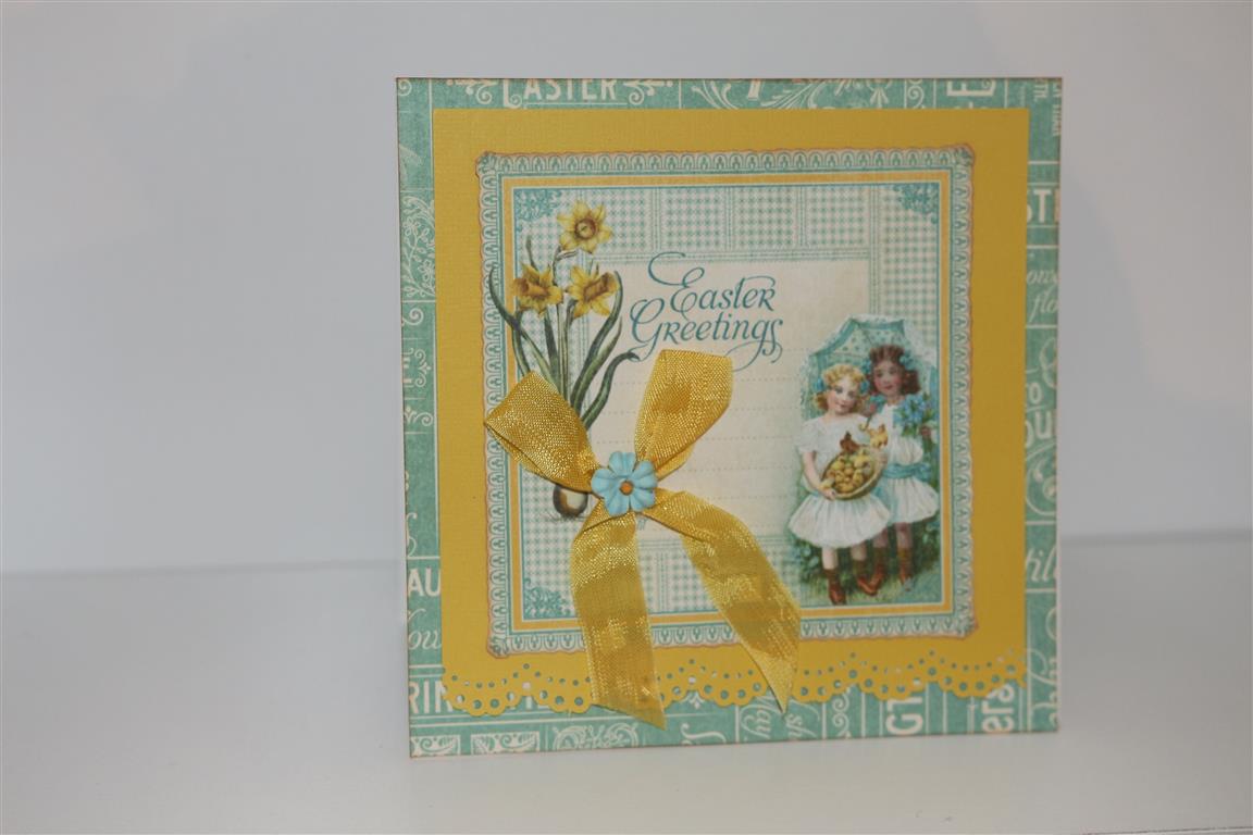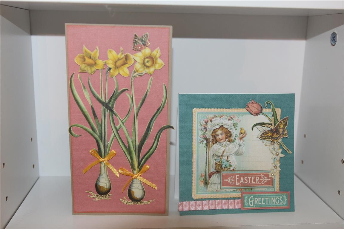 two quick cards today made with graphic 45 Time to flourish april sheets. On the left, a lot of fussy cutting ( this is more than likely going to be Mums Mothers day card as she loves daffodils) and on the right a very quick and easy easter card., with a little nit of fussy cutting stuck around the image for a bit of interest!we are having power cuts on and off today, luckily we have been warned, but every time the power comes back on there is a mad rush to the computer! it’s amazing how reliant we have become on technology! Til tomorrow….