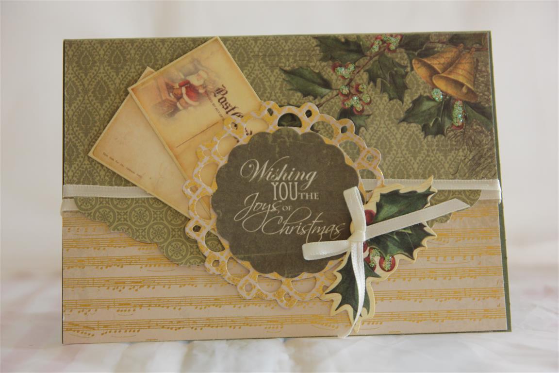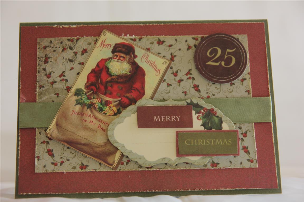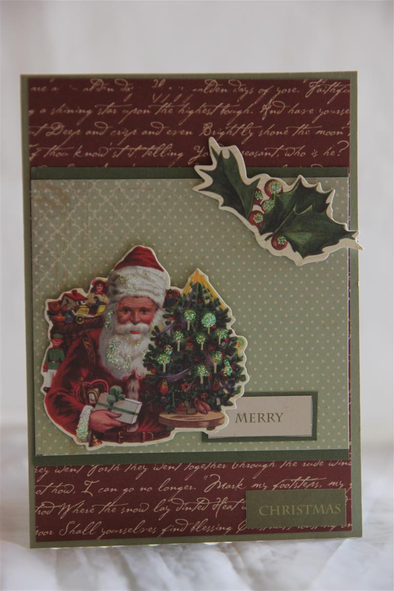 Today i used some Stampin up cardstock for the base card, and a layer of paper from the kaisercraft St. Nicholas 6″ pad. The image in the right hand corner is from a piece of the 12 x12 paper which I fussy cut, and I tucked 2 little post cards from the collectables pack in behind it. I stuck a piece of cream seam binding across the top of the card and mounted a sentiment greeting from the 6″ pad on top. This afternoon I have finally had a couple of hours in the craft room , so i am working on some orders. It’s back to work tomorrow so i won’t get much time in there until the end of the week. Til tomorrow….