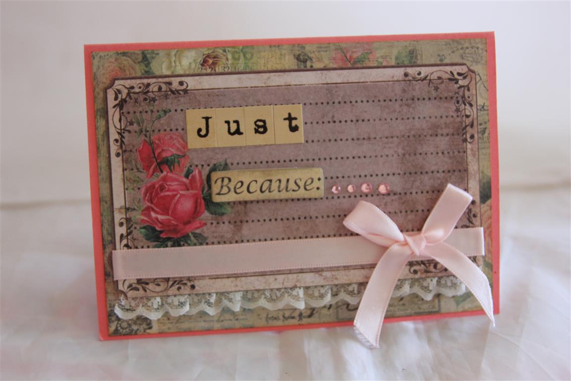 When I use 6″ paper pads, I always end up with 2″ strips left over, so for this card I used 2 of the strips, and ran some lace down the join. The paper , flowers and chipboard are all from the Prima Tea Thyme range, and I added a little bling flourish.I am making good headway sorting through my old papers, making the occasional card as I go, and collecting a little pile to give to my sister ( who has just started making cards) and my mum. I will have a little break tonight as I bought some gorgeous wool today, have dug out my knitting needles, and am going to start on a scarf ready for winter! Til tomorrow….