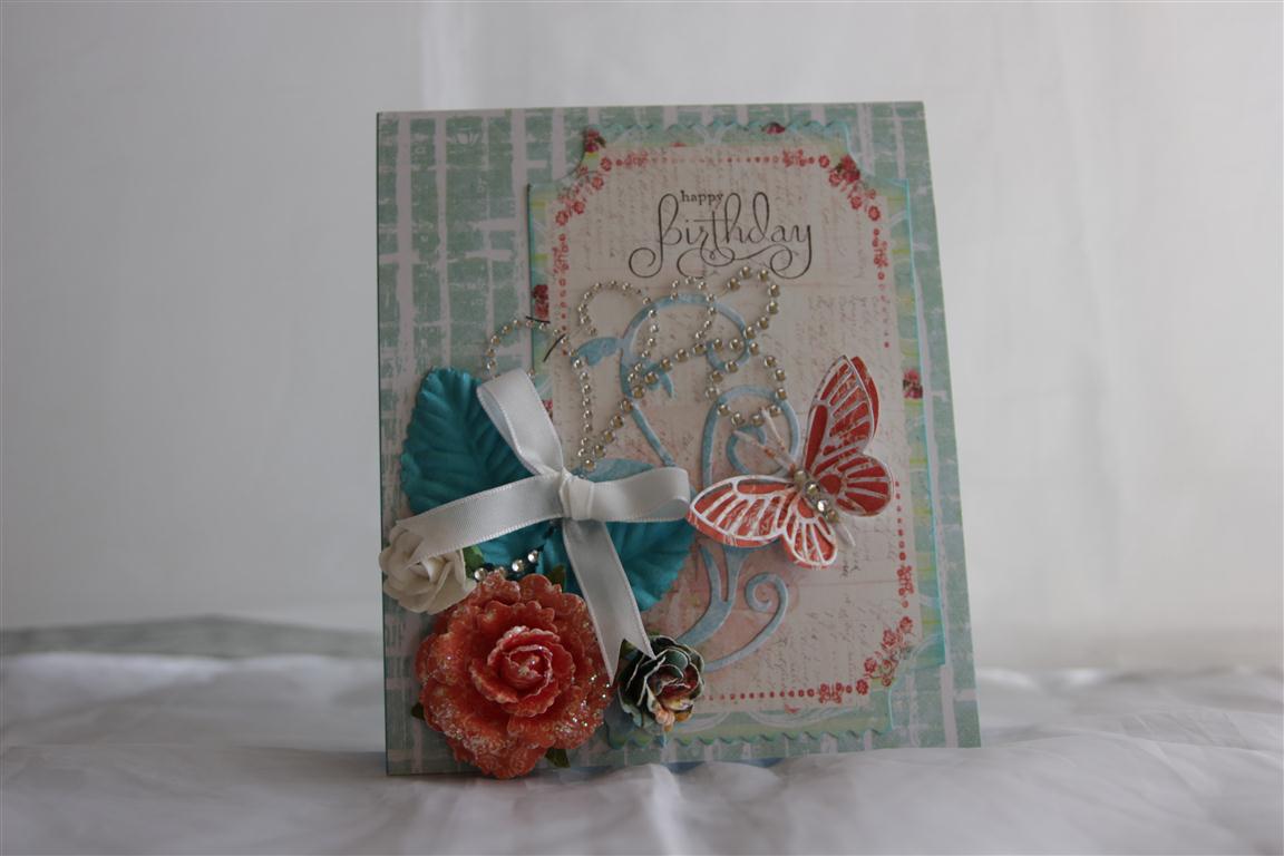 Todays card uses Prima Zephyr patterned paper and matching flowers, Leaves and Journalling notes.The Butterfly is actually 2 memory box dies – Kaliadascope and moonlight. There is a Cheery Lyn tropical flourish tucked in the back, and i added some ribbon, and lots of bling!The colours in this paper range are beautiful and rich, and a nice change from pink for Female style cards!I had a lovely day at paper flourish today, teaching my Mature ladies – lots of giggles which is always fun, but it’s back to work tomorrow, so an early night for me tonight… Til tomorrow…