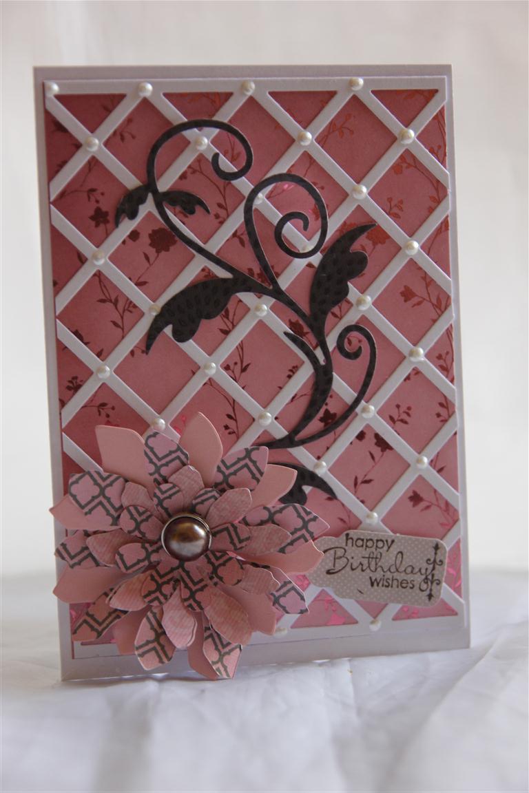 Two together for this post! Still with Anna Griffin Camilla collection, and matching die – cuts.The lattice is a die by Cheery Lyn designs, ( number 2) and I added ribbon,magnolia chandelier garland drops,hat pins, perfect pearls and kindy glitz to finish. I got sidetracked today and made a canvas art for my craft room door – will show it when Nathan photos it! Til tomorrow…