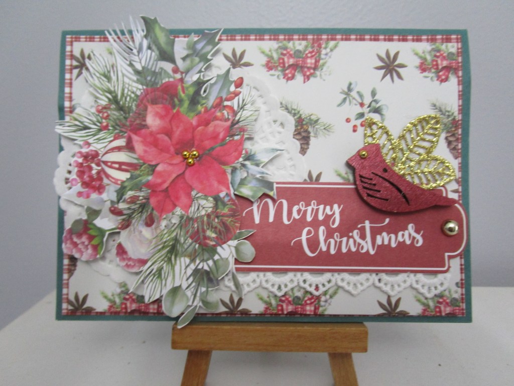 Here are the other three cards I made with Prima Christmas in the Country. I made these ( and the previous three cards) as a pack for my ladies, so there are six different papers out of the A4 paper pad, a few Prima holly branches ( gorgeous), a couple of metals and some cardstock. They are very simple to put together and I love the vintage feel!This week i have had a break from crafting as I did painting of a different nature and painted nathans bedroom. I am clearly a very messy painter as I am still trying to remove the splatters from my arms, legs and even toes!! Today I am looking forward to resuming my usual seat at my craft desk! til next time….