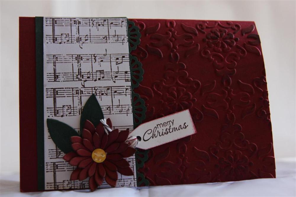 Very little christmas purchases used on this one! The cuttlebug folder is Winter Tress, and I used my Tim Holtz embossing diffuser to leave an oval at the bottom plain so that I could stamp straight onto the cardstock. The stamp used came from Stampin Up Welcome Christmas, then all I had to do was add some thin gold ribbon, and die cut a flower from my Die – namics Upsey daisies die. I used stampin Up Chery Cobbler and handsome Hunter cardstock to try to make it look like a Poinsetta. had a lovely morning with my Ladies this morning, and spent a little time this afternoon in the craft room, mainly looking for things – I have to clean that room out!Til tomorrow…