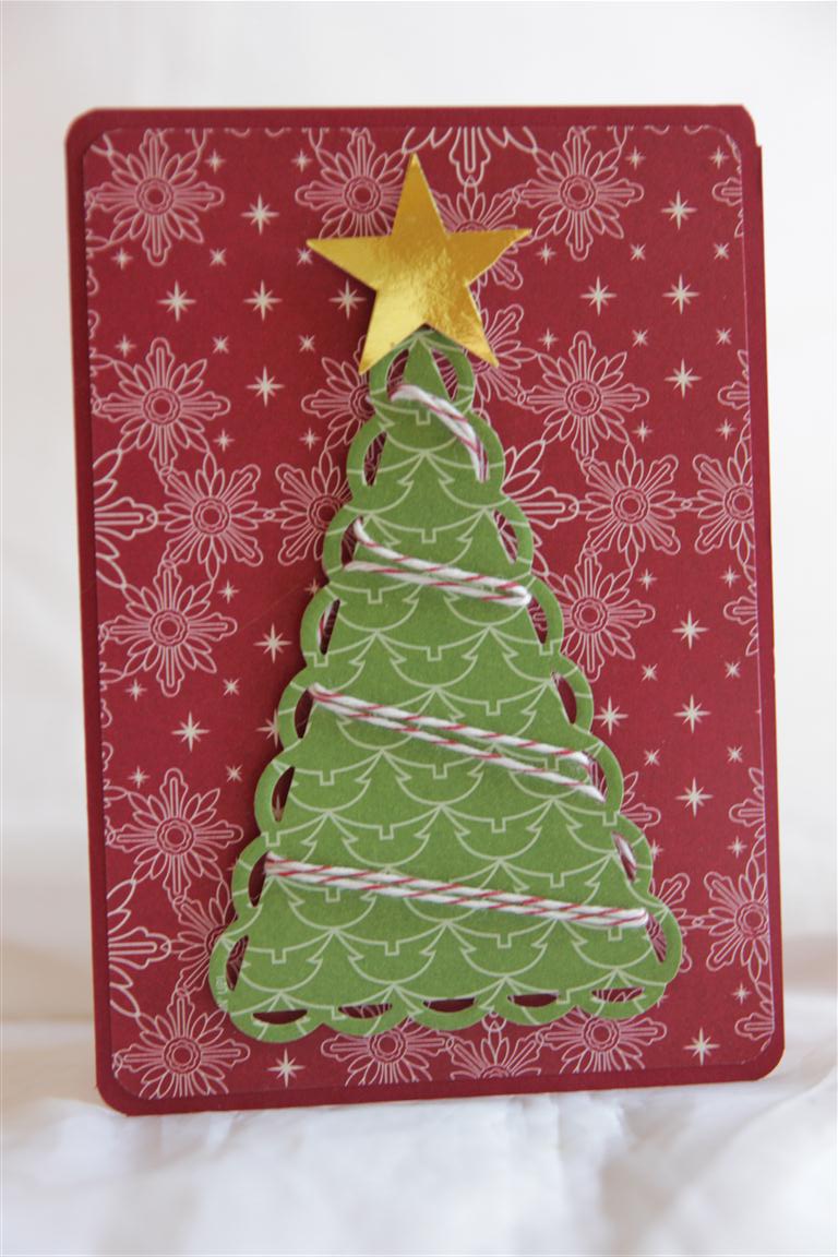 This is the second Christmas card I made using my Spellbinders Lacey Pennant dies. The designer paper is Stampin Up Be of Good Cheer, as is the cherry cobbler cardstock and bakers twine.I threaded the twine through the loops of the pennant, and will try this idea again when I find some glittery thin gold ribbon – I think that would look effective. I am working on some different projects this week, but pretty tired after work so not getting very far… Til tomorrow….