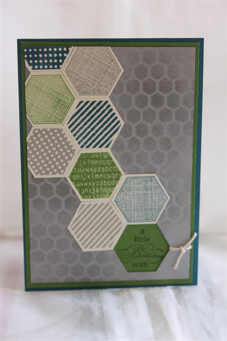 I recently purchased a new stamp set from Stampin Up – Six Sided sampler, along with a hexagon punch, and after i made the card on the previous post I took things a step further, and discarded all my patterned paper to make this card. I used 3 different colours – Smokey slate, bubblegum green and midnight muse ( cardstock and ink pads from Stampin up)and stamped a few hexagons onto cream cardstock which I then punched out. I had a hexagon template so I inked through that and I punched a hexagon out of my top layer so that the greeting would show through. I tied a little bit of string through the hexagon to draw attention to the sentiment.I have an idea in my head now to do one like this in yellow/orange with some butterflies…….Til tomorrow….