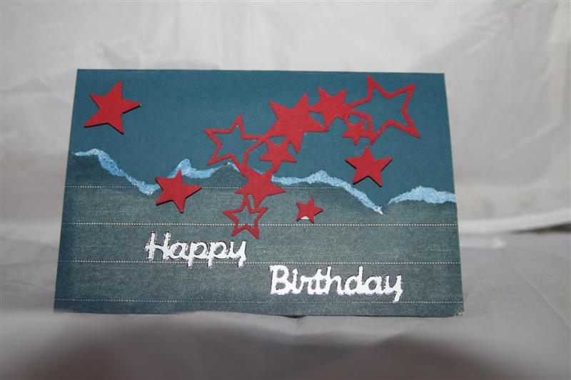 Here is my last card in my teen boy series, this time using the new Bo Bunny Weeekend Market papers – I love the rich colours of this paper and can’t wait to do some more with it -and my papermania happy birthday stamp which I stamped twice onto patterned paper and fussy cut out a few letters – and outlined a couple more with a marker. The stars are cut with my cricut and the wild card cartridge, and the cardstock is Stampin Up Cherry cobbler. I am busy this week making some cards to start filling those market boxes..Til tomorrow….