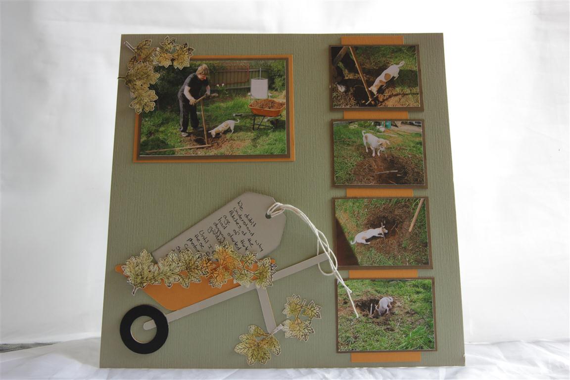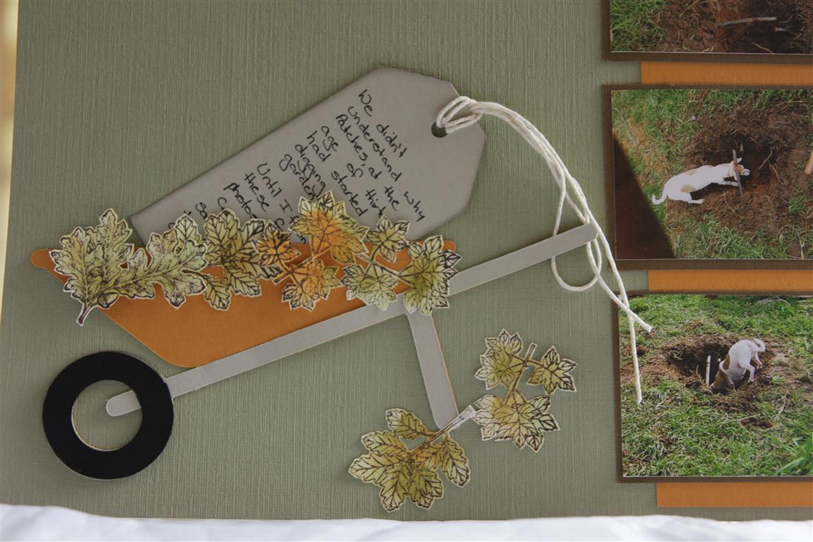 Now and again , I take a little break from cards, and create a scrapbook page. I am very new to scrapbooking,and because all in my family are males, I don’t get to break out the bling, so really have to rely on techniques and layering to create interest. For this page i used Stampin Up textured cardstock for the base, and more mustard, sahara sand, basic black and soft suede cardstock. I grabbed some random leaf stamps and sponged the images with old olive and more mustard, and I cut the wheelbarrow using my cricut and Walk in my Garden cartridge.The wheelbarrow was a handy spot to tuck my tag into! Dont forget to scroll down to see the whole page! Til tomorrow….