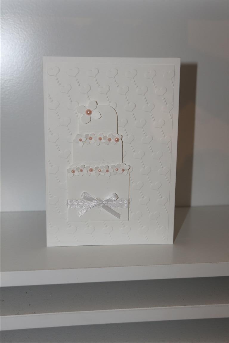 This is a card very similar to one of the cards my ladies made in a class last month.All white cardstock, and a piece of white cardstock run through a hearts embossing folder. For the cake I cut 3 squares – 5cm,4cm,and 3 cms and rounded the top corners of each, then stuck them together along the top edges of the squares. Mount on the card front with foam pads,add ribbon and punched flowers, some kaisercraft pearls,your own sentiment and this is a simple wedding card done!Off to work I go… til tomrrow…..