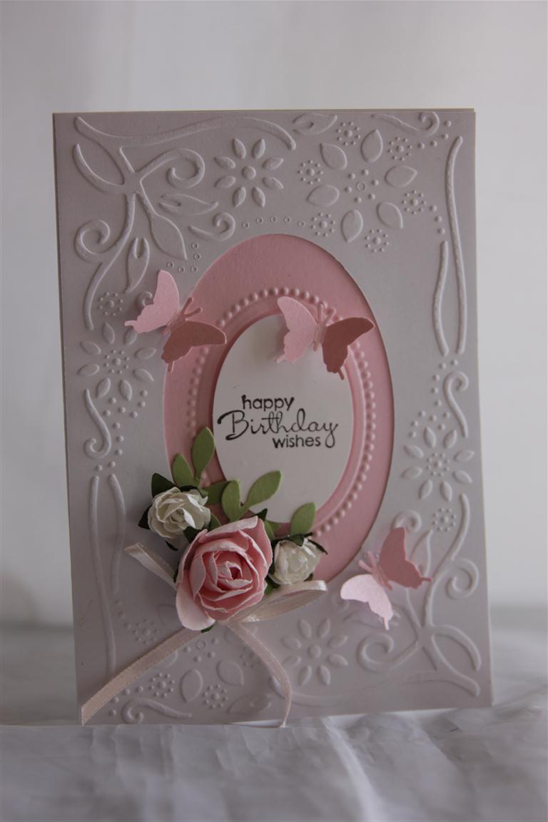 Todays card is all cuttlebug. The cuttlebug folder used is folder that cuts and embosses at the same time, and I used a Stampin Up designer frames folder for the embossed oval behind, and an oval punch for the greeting. The cardstock is stampin up whisper white and pink pirouette,martha stewart butterfly punch, and flowers and ribbon to finish! Have received some orders today, so the next couple of days will be spent doing them – lucky they aren’t xmas as all that is packed away1 Til tomorrow….
