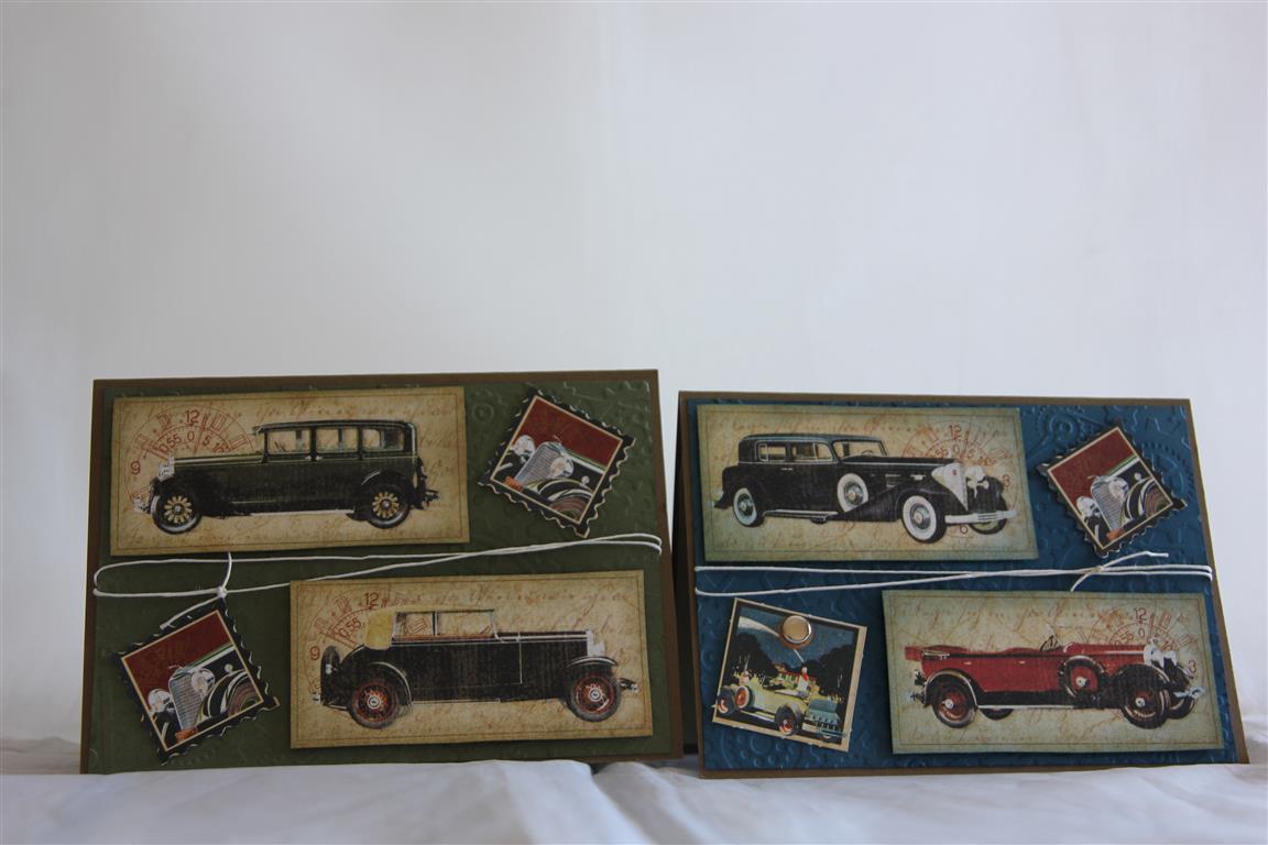 While on the subject of mens cards, which I think we were, here are a couple of quick makes, made while I had my graphic 45 papers out. the images are from graphic 45 A proper Gentleman, and although you can’t see it in the photo, I cut the same images twice, and 3’d them on top with foam pads. the embossing folder I used on the background layer is Cuttlebug clockworks, and I wrapped the whole layer with some string for a but more texture.Til tomorrow…