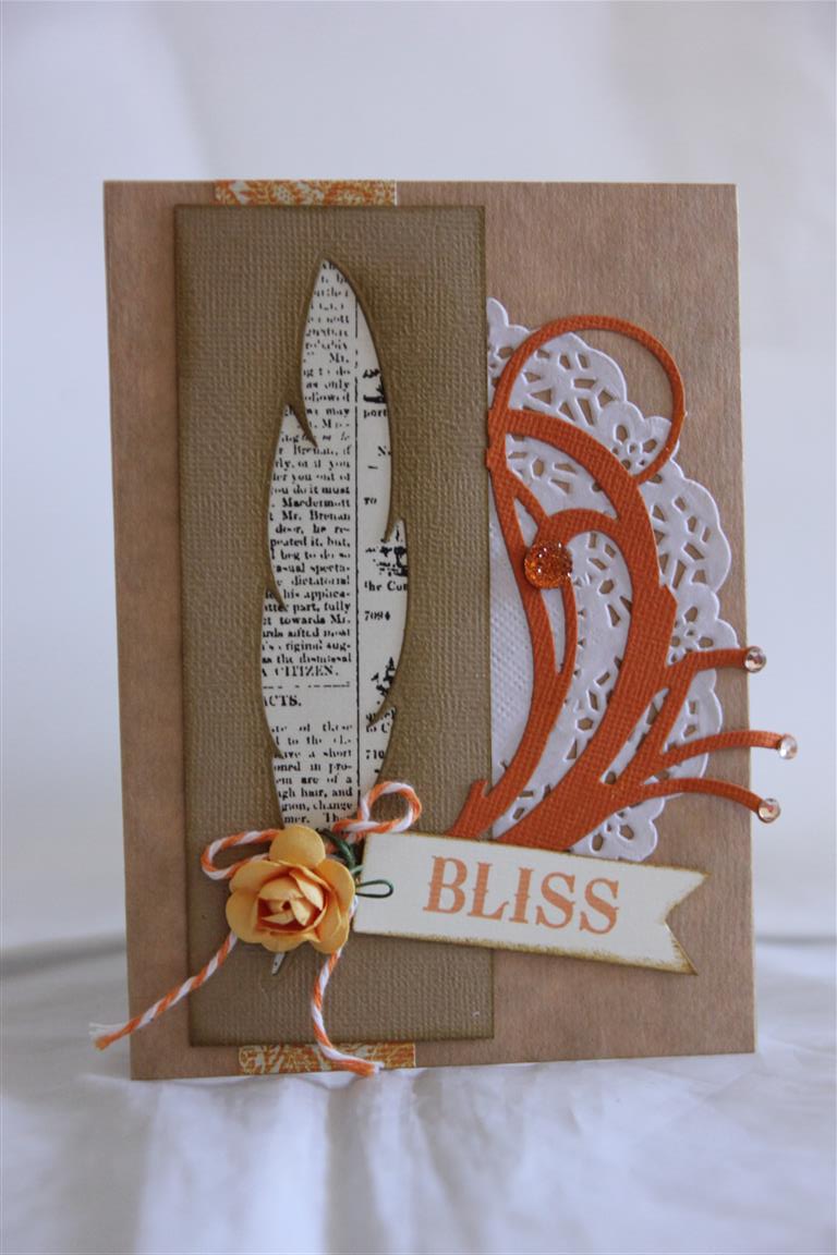 A little while ago I filmed a youtube clip for Paper Flourish showcasing some kaisercraft dies.The two dies I used were the flourish die and the feather die. This is one of the cards I created using these dies and some kaisercraft tropical punch paper. I die cut the feather, and then used the piece I would normally throw away – inked the edges with Tea dye distress ink, and backed it with some tropical punch paper. I love this effect and it has made me look at all my off cuts in a different way! I just added a doily, bling,flower and bakers twine to finish a different style of card for me.Oh, and I love kaisercraft dies. of all the dies I have used these ones cut the easiest – just fall away. no poking required.Til tomorrow….