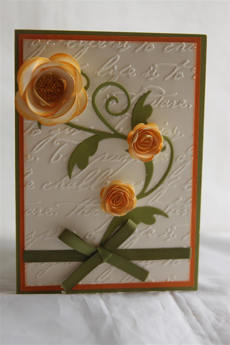 Todays card is made purely by utilising my cuttlebug and a couple of dies. The embossing folder is Cuttlebug Goochie script, and the 2 dies used are sizzix flowers – 3d ( for the flowers) and Cheery Lyn tropical flourish. I used stampin up cardstock, and did a bit of layering with Old olive,Pumpkin Pie and very vanilla, and just added a ribbon bow to finish.This is really a simple card, and would look good in a number of different colour combinations!I am all crafted out today, so i am going to have a bit of a break and watch some T.V. tonight! Til tomorrow….