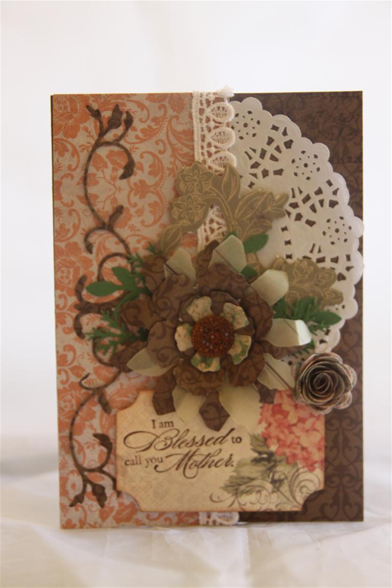 This one is kaisercraft these days papers, Sizzix tattered Florals and 3D Flowers dies, and memory box lord faunterloy die. I added a doily, lace, punched leaves, and the greeting was stamped with a stampin Up stamp – Blessed Mother. I like these colours – they make a change from the usual pinks that i often grab for Mothers day cards – What do you think? I will be found in the card room for a little while tonight, making some boys cards. til tomorrow…..