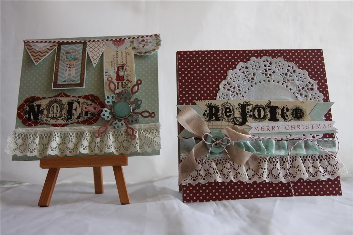 We are back to christmas cards, these ones are a little different – lets call them shabby chic with a contemporary twist! The paper is My Minds Eye All is Bright and I have also used the matching brads,buttons and stickers.I have made a lot of cards with these papers, the ideas kept coming, and it made a nice change from green and red! I used Spellbinders 2012 snowflake pendant dies on these cards too, just the right amount of modern design in these dies.Also used – lace,seam binding, a doily, and bakers twine.Thats it for today – til tomorrow….
