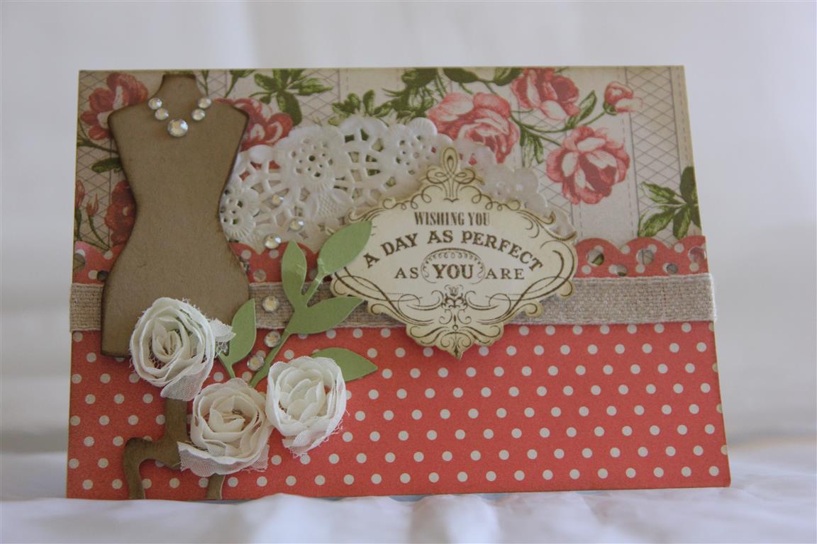 AS promised, I finally found my way back to Kaisercraft Madamoiselle paper collection! I abandoned this collection before playing properly with it due to Christmas makes and Cruise set up, but the other day I found it again and made some more cards with it. This is the first one, 12 x 12 papers for matting, with some embossing brown cardstock in between the layers. A dress form from the matching collectables pack, a doily layered in there too, some die cut leaves, and flowers and ribbon to finish. I edged around everything with tea dye distress ink, and the sentiment is from the matching 6″ pad.Over the next few weeks I will be going through my papers, having a bit of a clear out, I will take them to the craft fair with me . I always have trouble doing this – as I pull the papers out I see ideas and end up spending all my time crafting and not tidying..so we will see how I go..Til tomorrow….