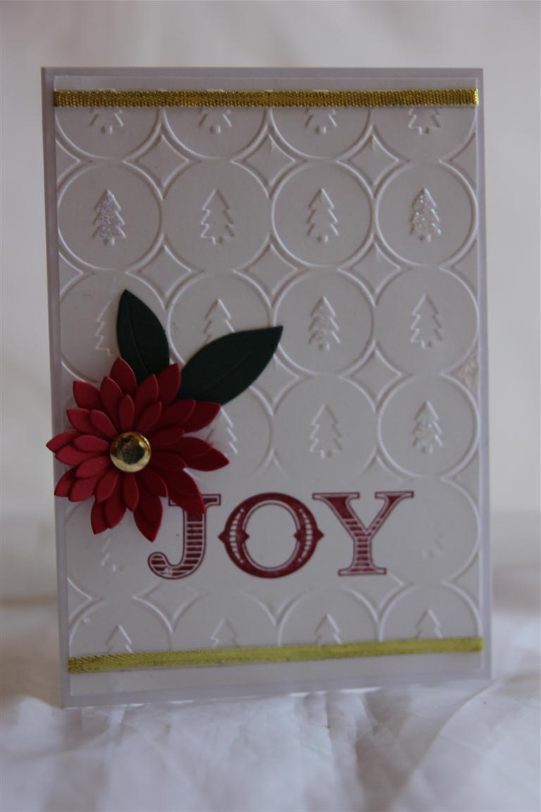 Very little christmas purchases used on this one! The cuttlebug folder is Winter Tress, and I used my Tim Holtz embossing diffuser to leave an oval at the bottom plain so that I could stamp straight onto the cardstock. The stamp used came from Stampin Up Welcome Christmas, then all I had to do was add some thin gold ribbon, and die cut a flower from my Die – namics Upsey daisies die. I used stampin Up Chery Cobbler and handsome Hunter cardstock to try to make it look like a Poinsetta. had a lovely morning with my Ladies this morning, and spent a little time this afternoon in the craft room, mainly looking for things – I have to clean that room out!Til tomorrow…