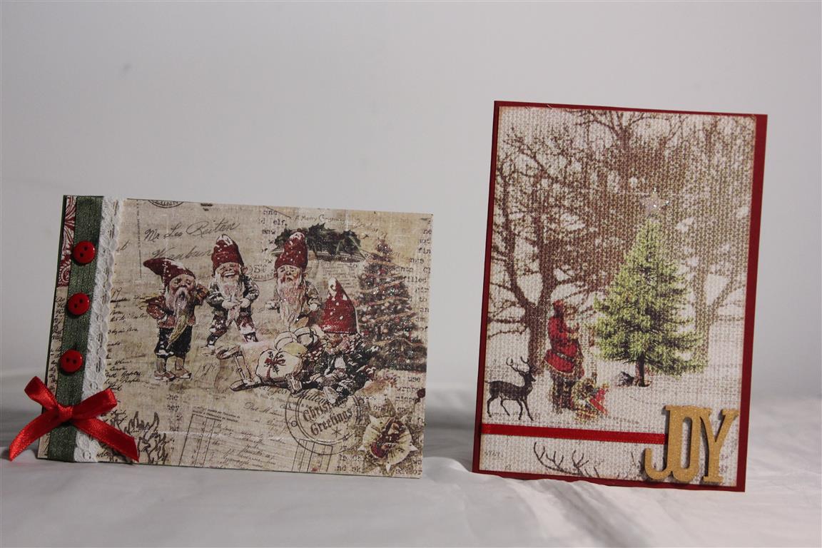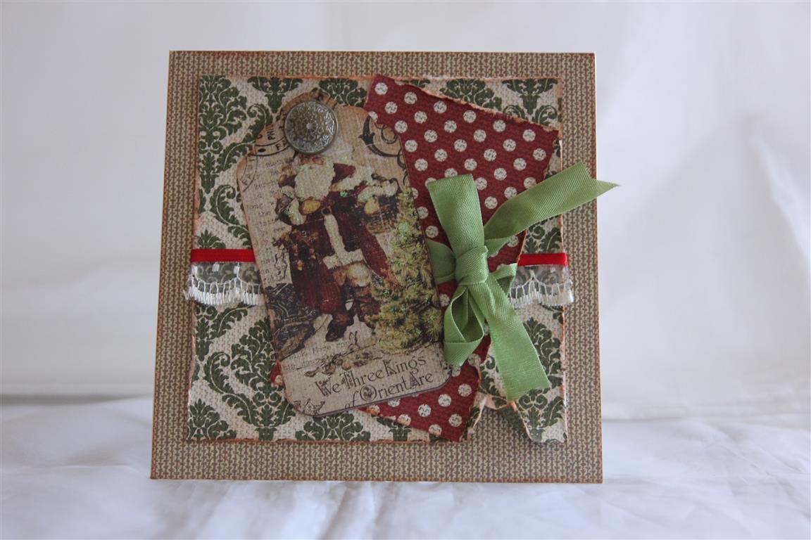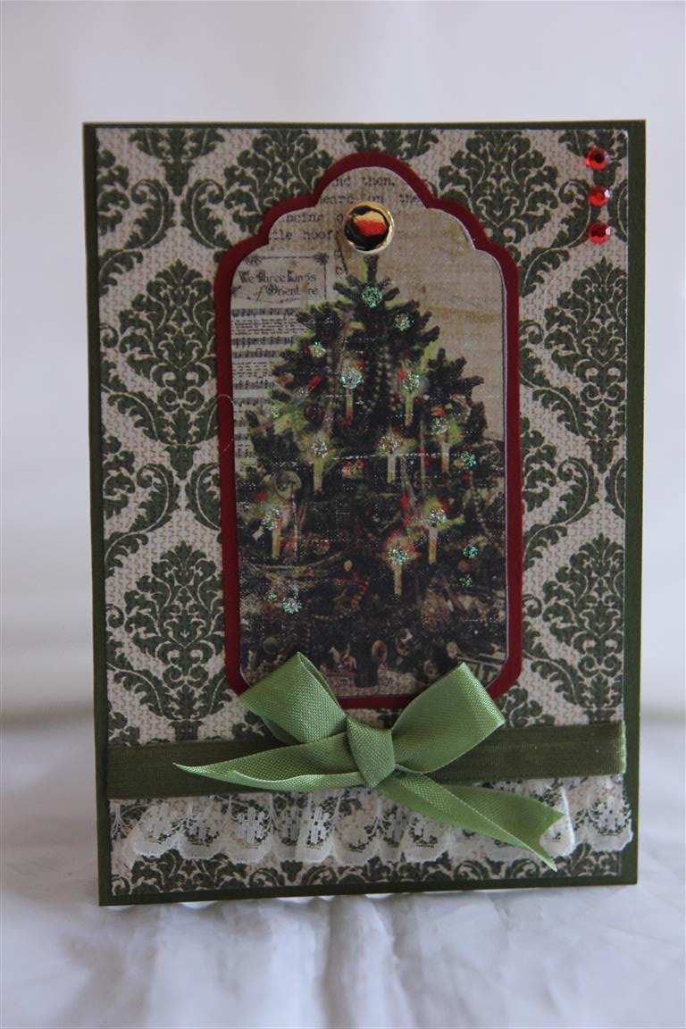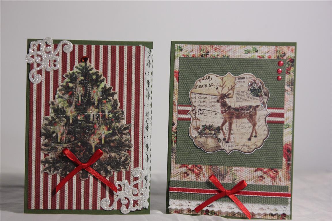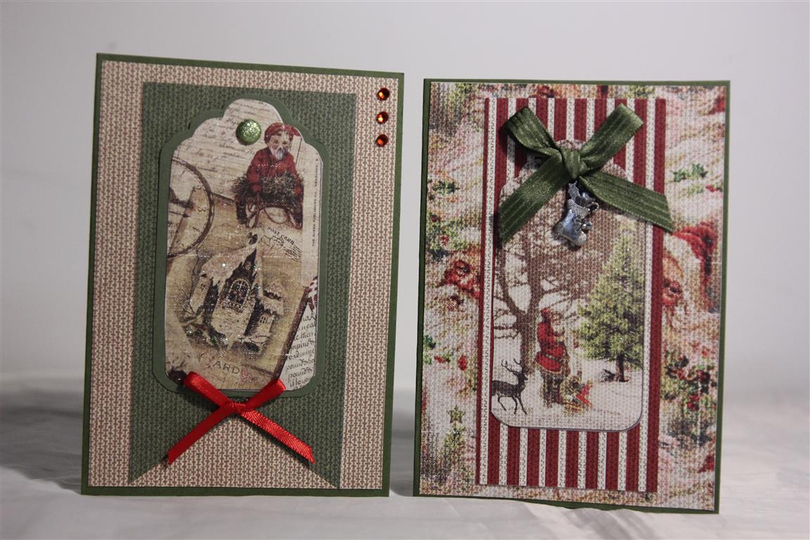 Three cards this morning made with Fabscraps christmas paper. I bought a few sheets of this paper, one had images of tags which I cut out, and these pieces are the focus of the cards. Some stampin up cardstock, lace , ribbon,bling, and a charm on the middle card finished these vintage style cards. A couple more to show next time.. til tomorrow….