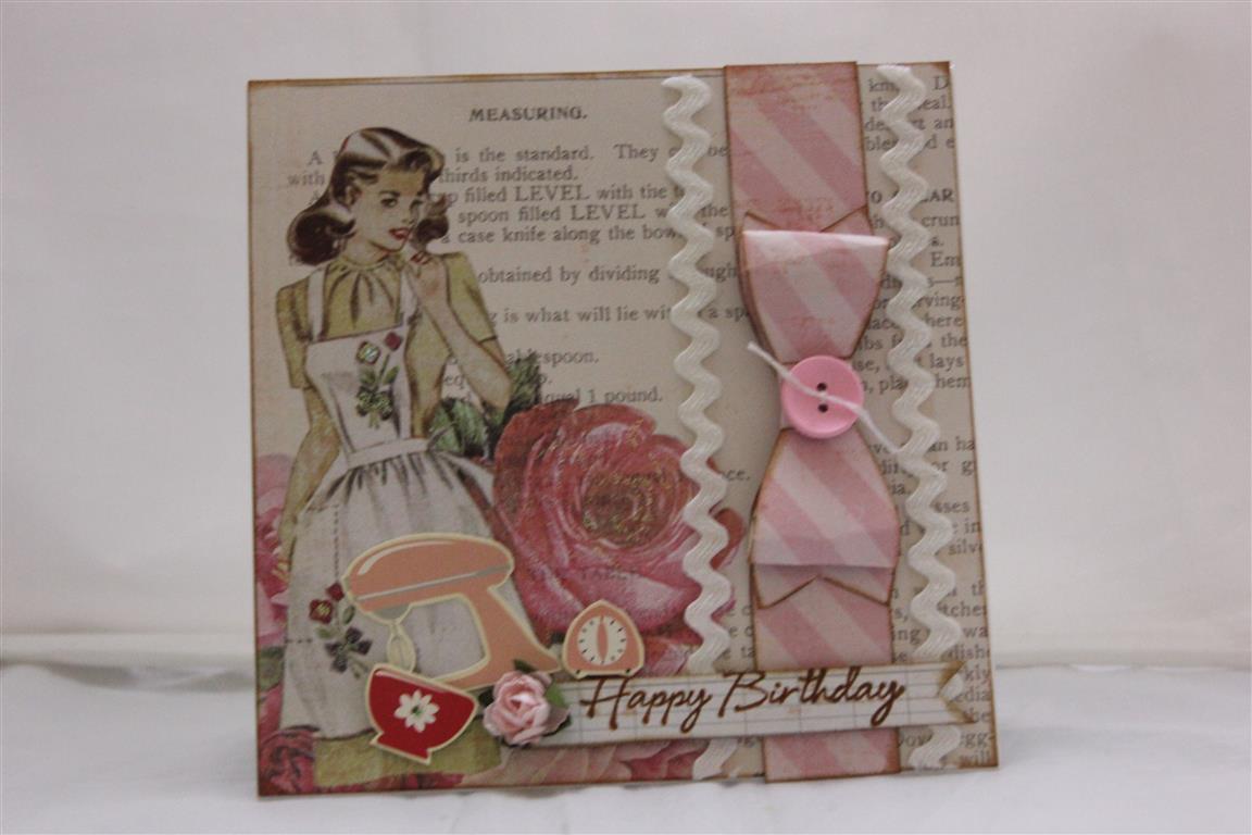 I used all kinds o bits and pieces for this card – the papers are Ruby Rocket Cook, and I found some ( very old) ric rac in the bottom of my sewing box, some chipboard pieces that I think came off the front of a magazine as a freebie, a button and some thread, and I made a paper bow which I inked around with tim holtz tea dye ink. I really like the paper bow, and will be making more cards with these on them!All that was left to do was to add a flower, and stamp the sentiment.No cards tonight – after my evening out last night there are a few jobs to do around here , so Til tomorrow…..