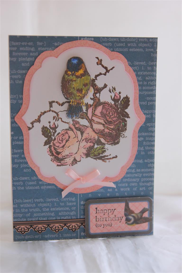 Quick post tonight as I am a bit tired after my two days at the craft fair, and one more day still to go. It’s been great fun, meeting new people, seeing lots of familiar aces, and selling lots! todays card is made using kaisercrafts new range – Porcelain Rose. I particularly like this one as it has a few different colourways as you will see over the next couple of days. For this card I used the 6″ pad and matching collectables, and added a hand rolled flower ( easy to do – just punch out a circle, cut it into a spiral and roll it up) a kaisercraft flower, ribbon and a stampin up sentiment stamp. I am off to put my feet up – Til tomorrow…..