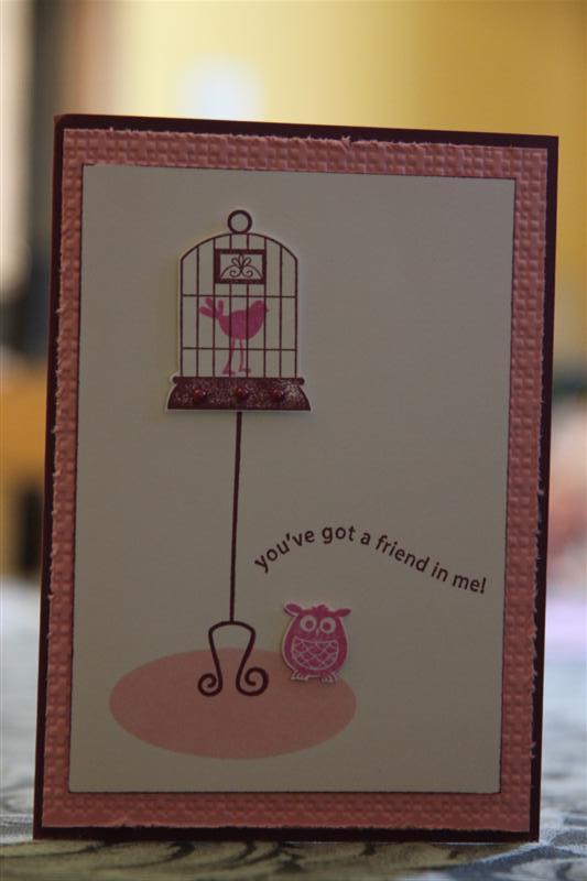 Now straight away I have to say I got the inspiration for this card from www.astampingjourney.wordpress.com. In particular I loved the idea of sponging through an oval punch off cut to ground the birdcage. I have added a few of my own touches, and removed some design concepts from the original,but the colours used are the same. I used Stampin Up rich razzleberry and pretty in pink cardstock, and Avairy and Cheep talk ( for the sentiment) stamp sets.I also used a Stampin Up embossing folder. Today has been a day of great excitement as my order from Ohmycrafts in America came today so I have a new Cricut cartridge and 3 paper collections to play with! There is definitely not going to be enough hours in the day this weekend!Til tomorrow….