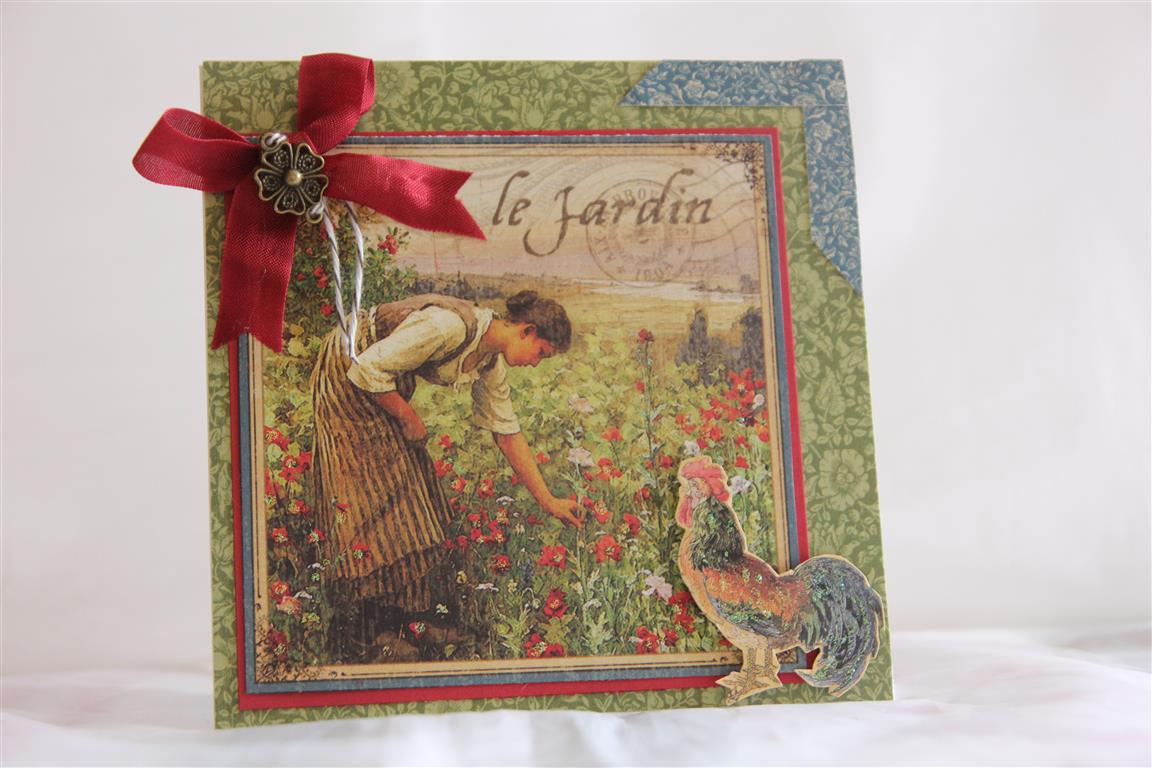 I was always going to do something with this image on one of the Graphic 45 french Counrty papers. It’s a lovely picture, so i have matted itwith red cardstock,and fussy cut a rooster to pop on the corner. I used a strip of paper to make into a corner and added a seam binding bow tied with bakers twine and a charm to finish.This one may end up framed on my craft room wall!Had a lovely afternoon cardmaking with one of my most favourite people, and now I am ready to sit and watch a little t.v. with a nice cup of tea! til tomorrow….