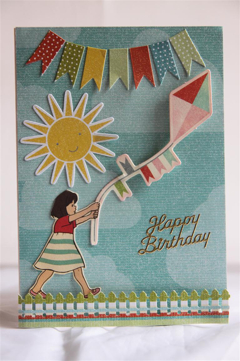 Today we are up to number three in my Fine and Sunny series using kaisercraft papers, and stickers, and martha stewarts picket fence punch. the little girl with the kite was fussy cut rom a piece of October Afternoon sidewalk paper, and the flag banners across the top were sickers on the Fine and Sunny sticker sheet, which brings me to my handy hint . I have made a lot of cards this week which feature various sizes of this type of banner, and even based my Paper flourish lesson for may around a few of them, and have only just now after all the work is done discovered that if you put the end of your strip into the corner of a square punch you get this banner effect cut on the end of your strip. this discovery would have saved me hours of measuring time! Any of my ladies reading this – please bring your square punch to the May lesson if you want to impress the other ladies! I have had a highly productive day in the card room.I have set up my village lesson, just in time for next Friday night, but a bit of a disaster – my Martha Stewart fern punch broke – bits of metal flew everywhere, and one of the cards relies on this punch so I am off to Paper Flourish on Sunday where hopefully I can replace it .. bit of a problem if I can’t.I also made a wedding card for my cousin, but all this was just procrastination because I have to make some teenage boy birthday cards – the hardest group of all to make for. I have made a start and we will see what happens. For now I am off to get my gear ready for work tomorrow – a bit hard because I feel in long weekend mode…Til Tomorrow….