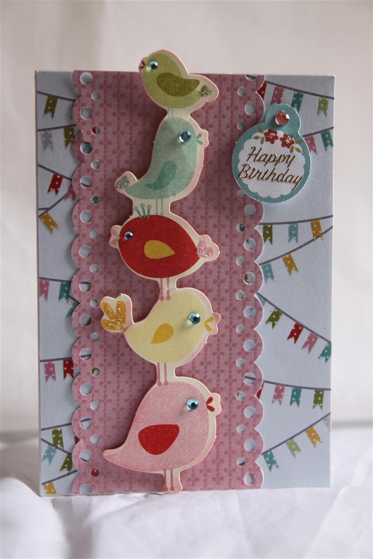 That title is not a weather report for us here in Adelaide. As I sit and type we are in the middle of a storm, and it is freezing! Still maybe if I type it enough it will happen – so – The papers I used on this card were Kaisercraft Fine and Sunny, and the tower of birds were in the matching collectables pack. I used a Martha Stewart Punch to decorate the edges of my paper,and just added some kaisercraft rhinestones to the little birds eyes. I am teaching a class tomorrow at Paper Flourish, so tonight will be spent getting my craft bag organised. Til tomorrow….