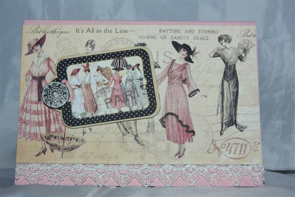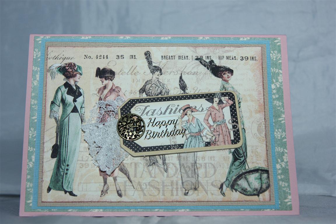 This is my favourite piece of paper from the Graphic 45 a ladies Diary collection, so didn’t do too much to it – just sponged around the edges, and mounted it on a couple of layers of bazzil cardstock, before mounting that onto another piece of patterned paper and then the whole lot onto my stampin Up Blushing Bride cardstock base. I added a matching chipboard, piece of lace and a stampin Up vintage brad.Hope to get into the card room tonight – I have put a heater in there so no excuse! Til tomorrow…..