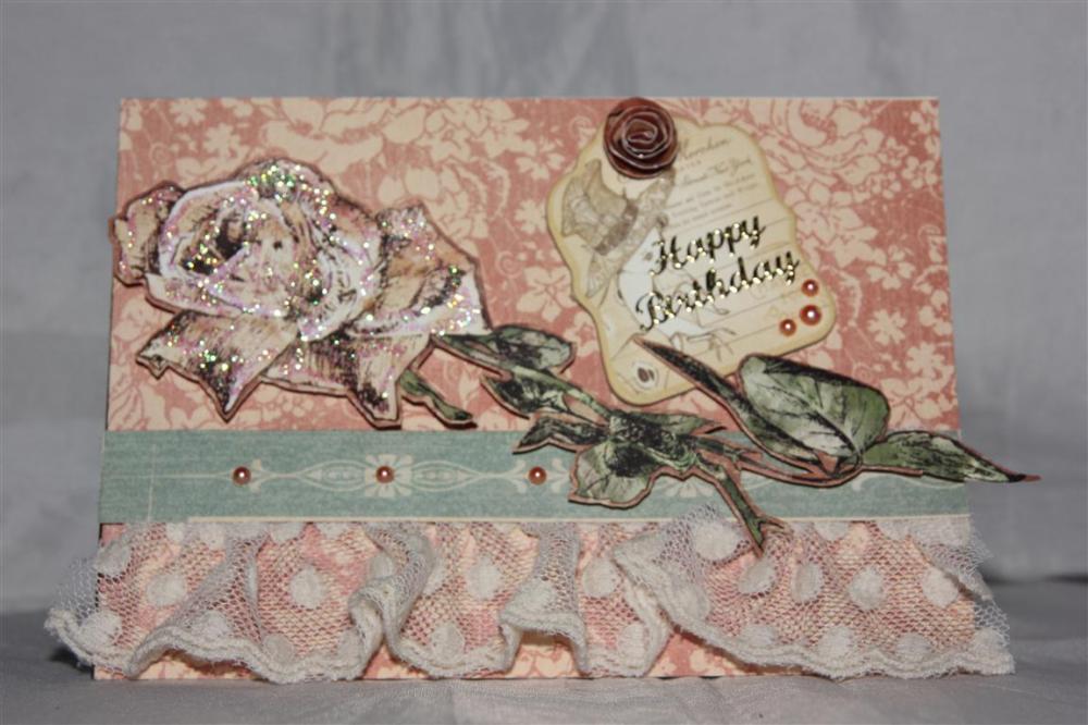 While we are on graphic 45 a ladies diary, I will continue on, and show the other two in this group, today and tomorrow. Can you tell I really like this paper? it didn’t take long for my thoughts to turn to fussycutting, which is what I did with the rose and mounted it with foam pads. I hand cut a circle, and roughly cut it into a spiral and rolled it to make the flower on top of the Chipboard piece ( still in the Graphic 45 a ladies diary collection) . I gathered some lace across the card, and stuck a srtip of paper across the top of that and then all I had to do was bling it all up with kaisercraft pearls and kindyglitz . Tonight I am looking forward to rummaging around in my Xmas boxes. I thought I only had one tub, but have discovered that I actually have two and if I don’t use some of this papers etc I am not going to be able to justify buying any new stuff this year! That would be a disaster! Til tomorrow….