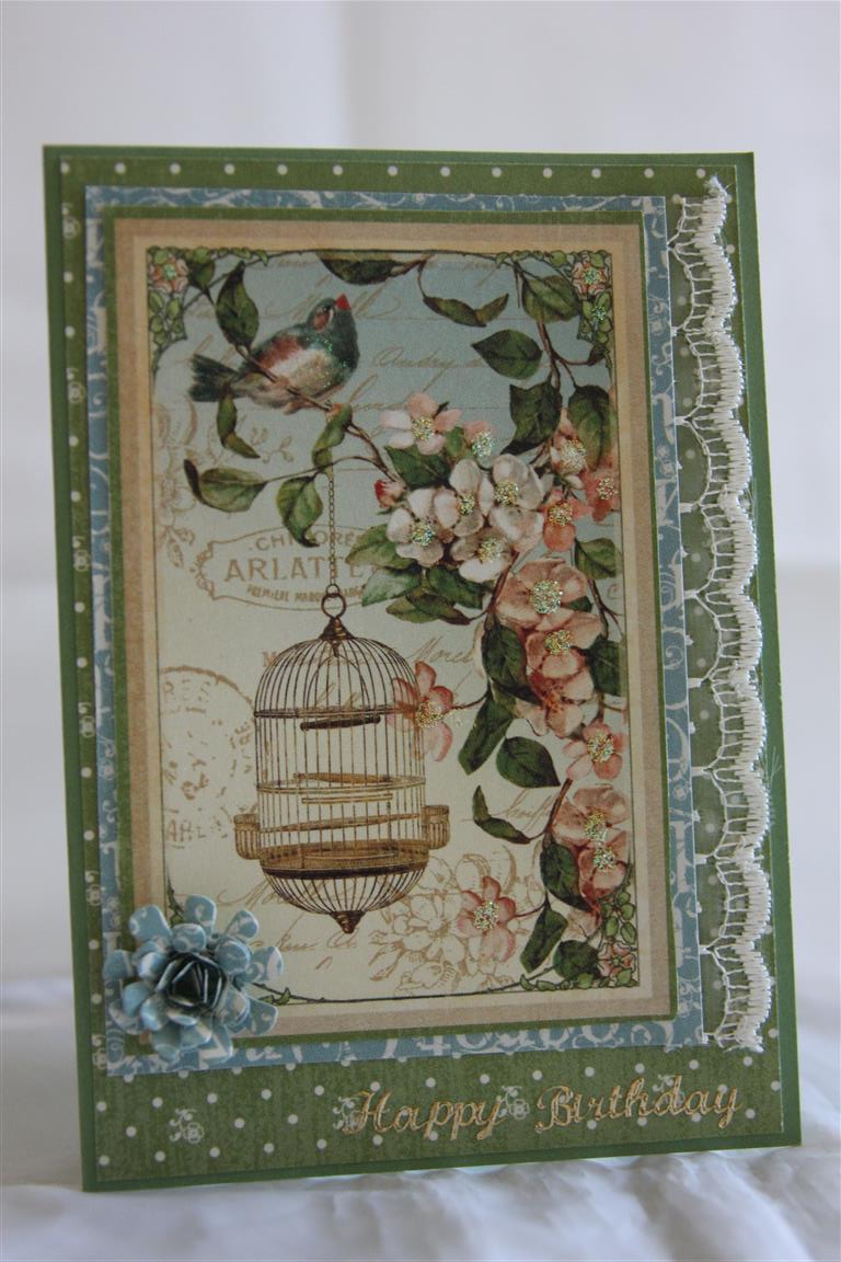 I only bought this range of papers ( Graphic 45 secret garden) the other day, but I couldn’t wait to start creating with it. it is by far my favourite range of papers at the moment! This first card is very simple, just one piece of patterned paper onto my card base, a little fussy cutting of another sheet and some lace, stampin up trim , a flower and some leaves punched from martha stewart frond punch to finish.Still hot here, I taught a very small class this morning, and we had some issues with the glue drying too quickly ( thats never happened before) so once again, there will probably be no crafting tonight – I am a bit over this hot weather! Til tomorrow….